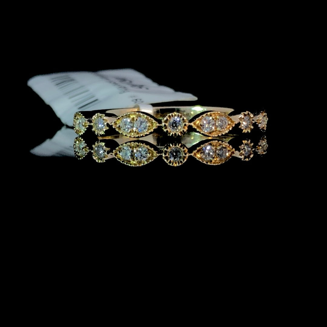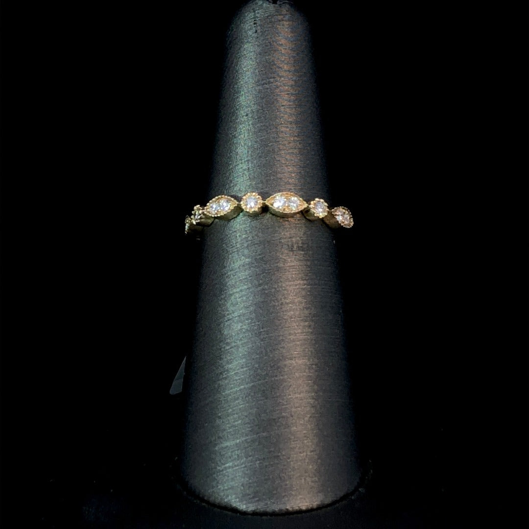 This exquisite anniversary band radiates sophistication and elegance with its stunning milgrain detailing and alternating shapes. Crafted from 14kt yellow gold and adorned with .16ctw of round diamonds, it will elevate any look with its timeless luxury and exceptional sparkle. This ring is a size 6.5. If that size is not a perfect fit, first time sizing is free at the time of purchase.