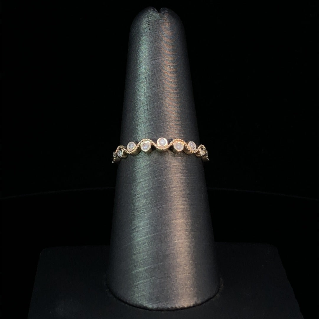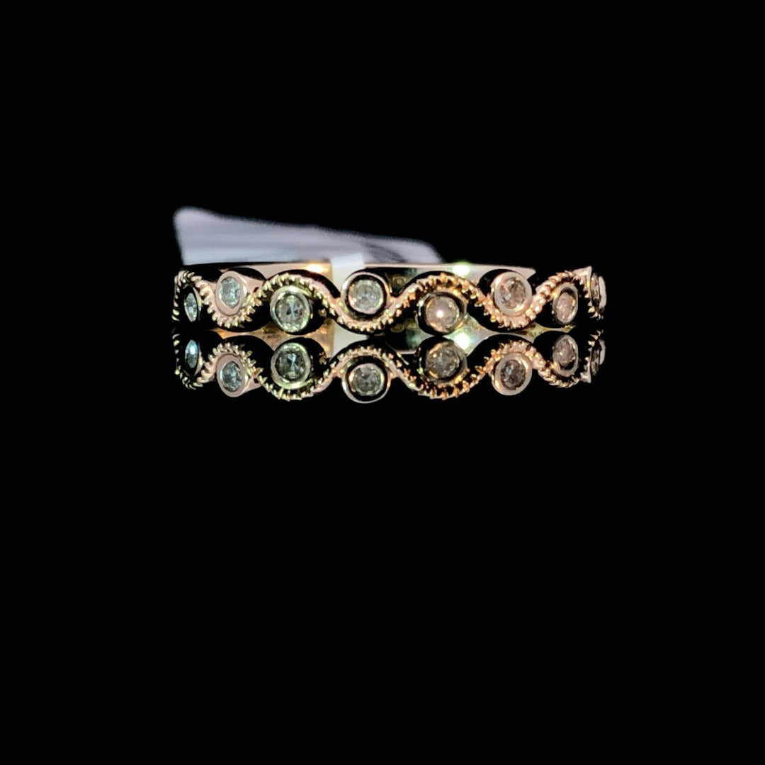 Make a statement without saying a word with this eye-catching swirl diamond band! The perfect way to add a hint of sparkle to your look, this 10kt yellow gold piece hosts .07 ctw of dazzling round bezel set diamonds along with milgrain detailing. An unforgettable look for any day! This ring is a size 7. If that size is not a perfect fit, first time sizing is free at the time of purchase.