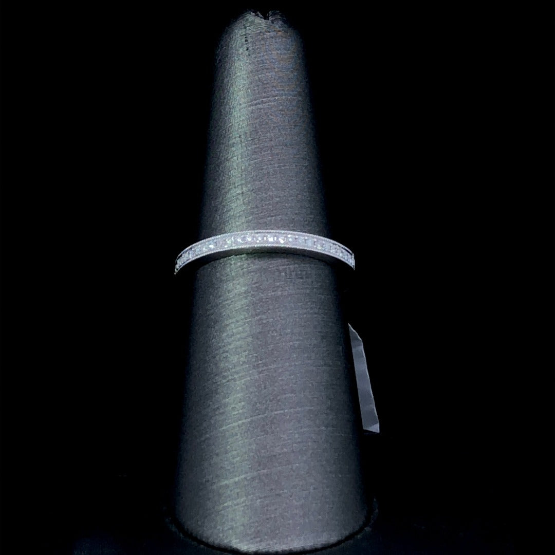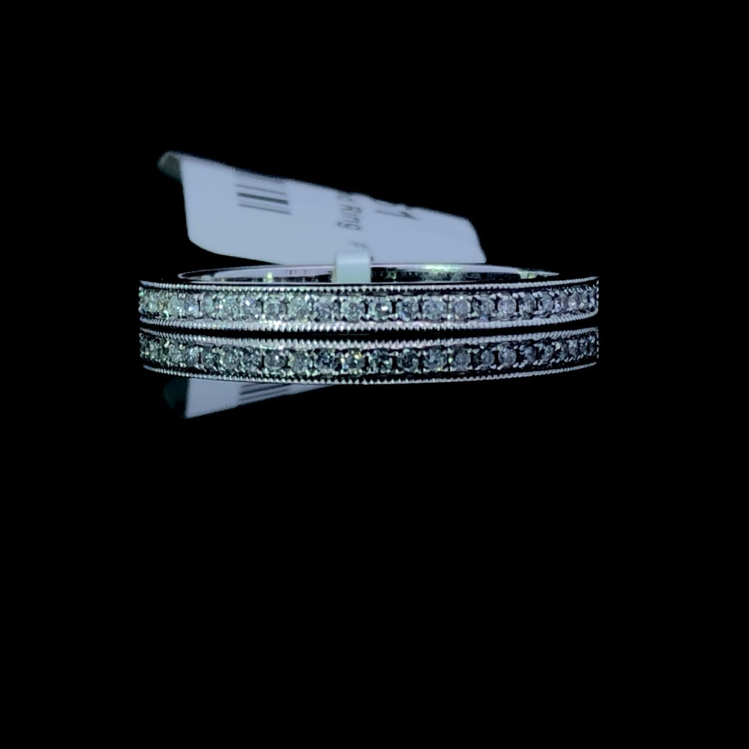 This 14kt white gold anniversary band radiates a delicate brilliance with .12ctw of round and sparkling diamonds. Perfect for life's most special occasions, its sophisticated and tasteful design will elegantly commemorate your bond. This ring is a size 6. If that size is not a perfect fit, first time sizing is free at the time of purchase.