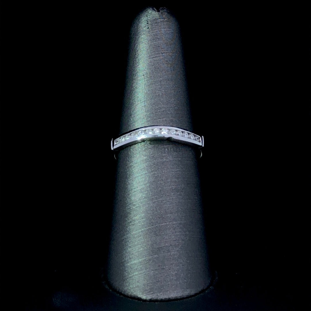 This exquisite anniversary band is crafted with incredible detail; with sparkling .22 ctw of round diamonds set in a luxurious 14kt white gold euro band, it's an elegant token of your eternal love. Exquisitely designed, this band blends sophisticated glamour with timeless grace. This ring is a size 7. If that size is not a perfect fit, first time sizing is free at the time of purchase.