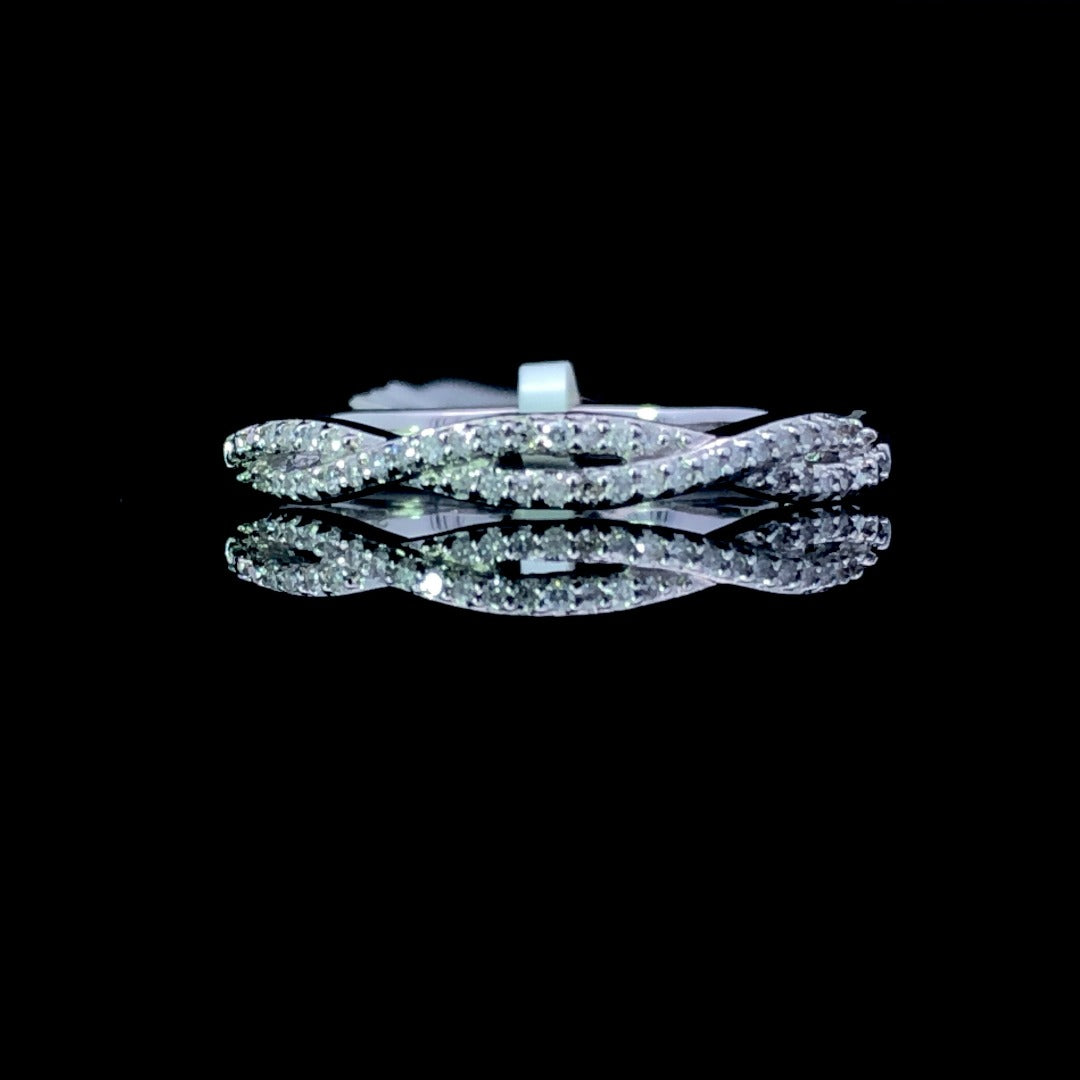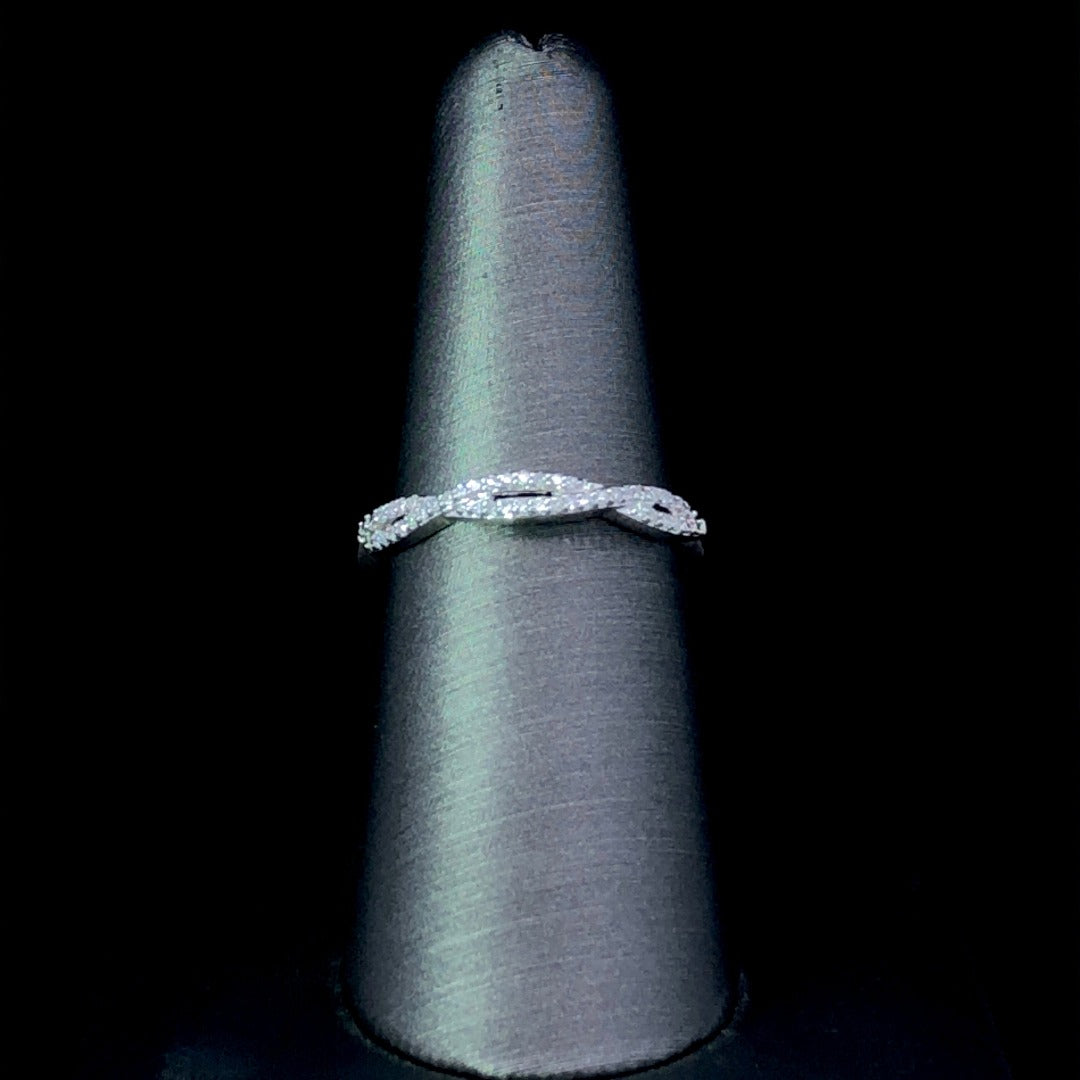 Sparkle and shine with this magnificent 10kt white gold anniversary band. Crafted with a twisted band and encrusted with .12ctw of round diamonds, this ring is perfect for marking a special milestone. Enjoy the elegance and luminosity of this luxury piece which will add a glistening touch to any occasion. This ring is a size 7.25. If that size is not a perfect fit, first time sizing is free at the time of purchase.