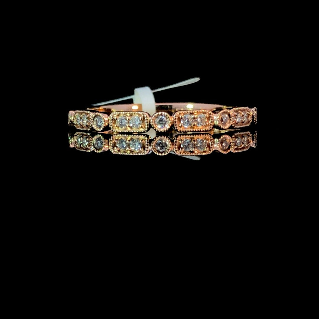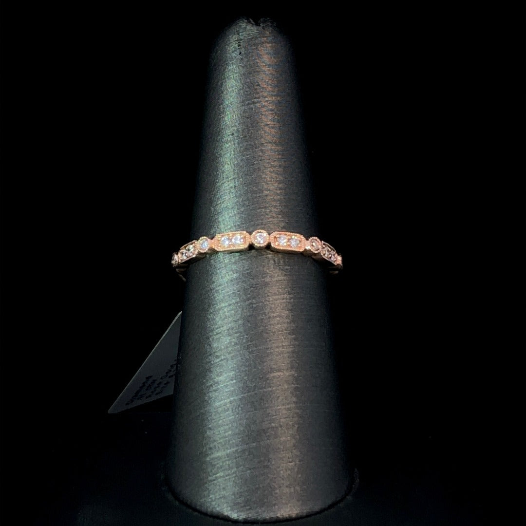 Celebrate a special occasion with this lustrous 14kt rose gold anniversary band, boasting .11ctw of shimmering round diamonds set artfully in a design with milgrain detailing and delicate shapes. It is the perfect token of your enduring love and commitment. This ring is a size 6.75. If that size is not a perfect fit, first time sizing is free at the time of purchase.