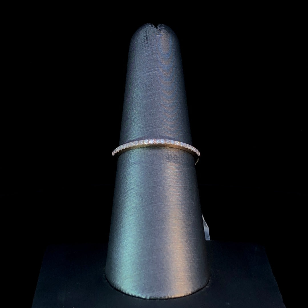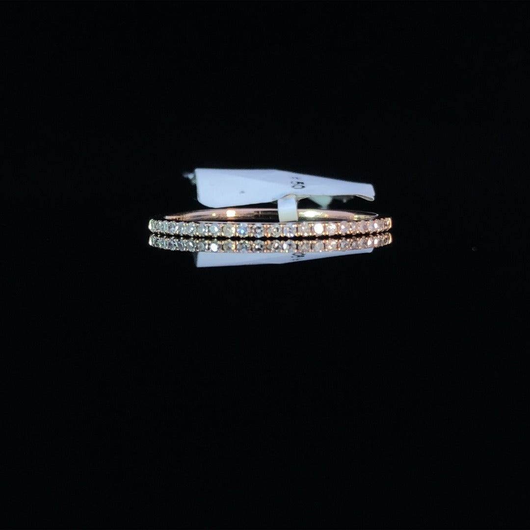 Indulge in the luxurious sparkle of this dainty diamond band. Crafted from 14kt rose gold, the delicate design showcases .10ctw of round diamonds, creating a refined and elegant look. Perfect for adding a touch of glamour to any occasion. This ring is a size 7. If that size is not a perfect fit, first time sizing is free at the time of purchase.