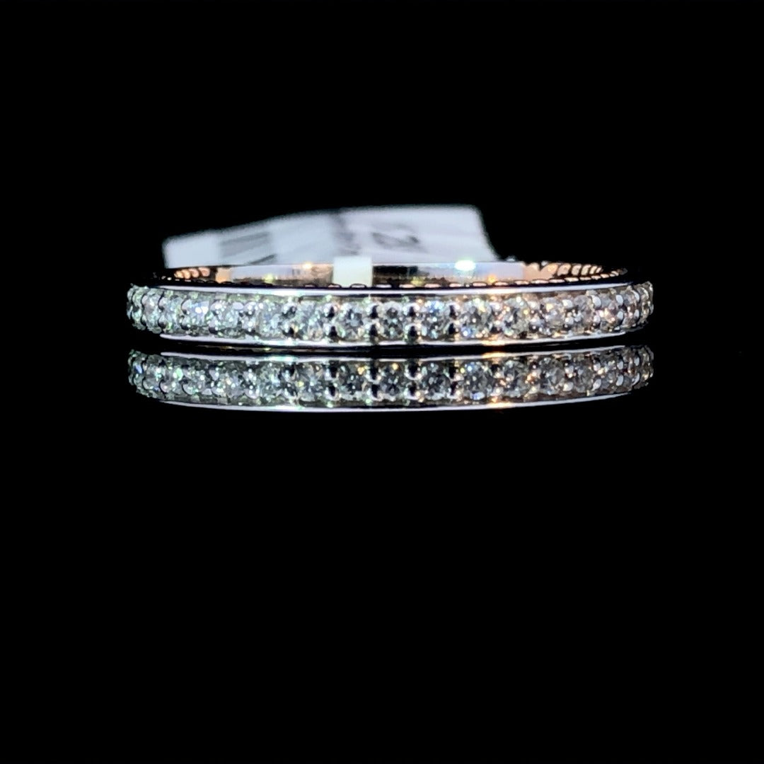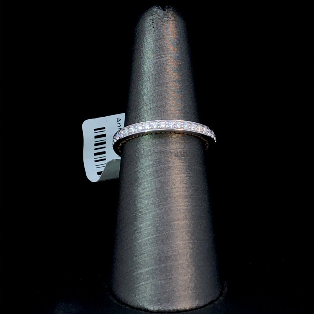 This exquisite diamond band is a classic design, showcasing .24ctw of dazzling round diamonds prong set in 14kt white gold, highlighted by a rose gold beading beneath for an added touch of refinement. An elegant band that will captivate the eye of any admirer, this piece is an exquisite choice for any occasion. This ring is a size 6.5. If that size is not a perfect fit, first time sizing is free at the time of purchase. Additional sizing fees may apply.