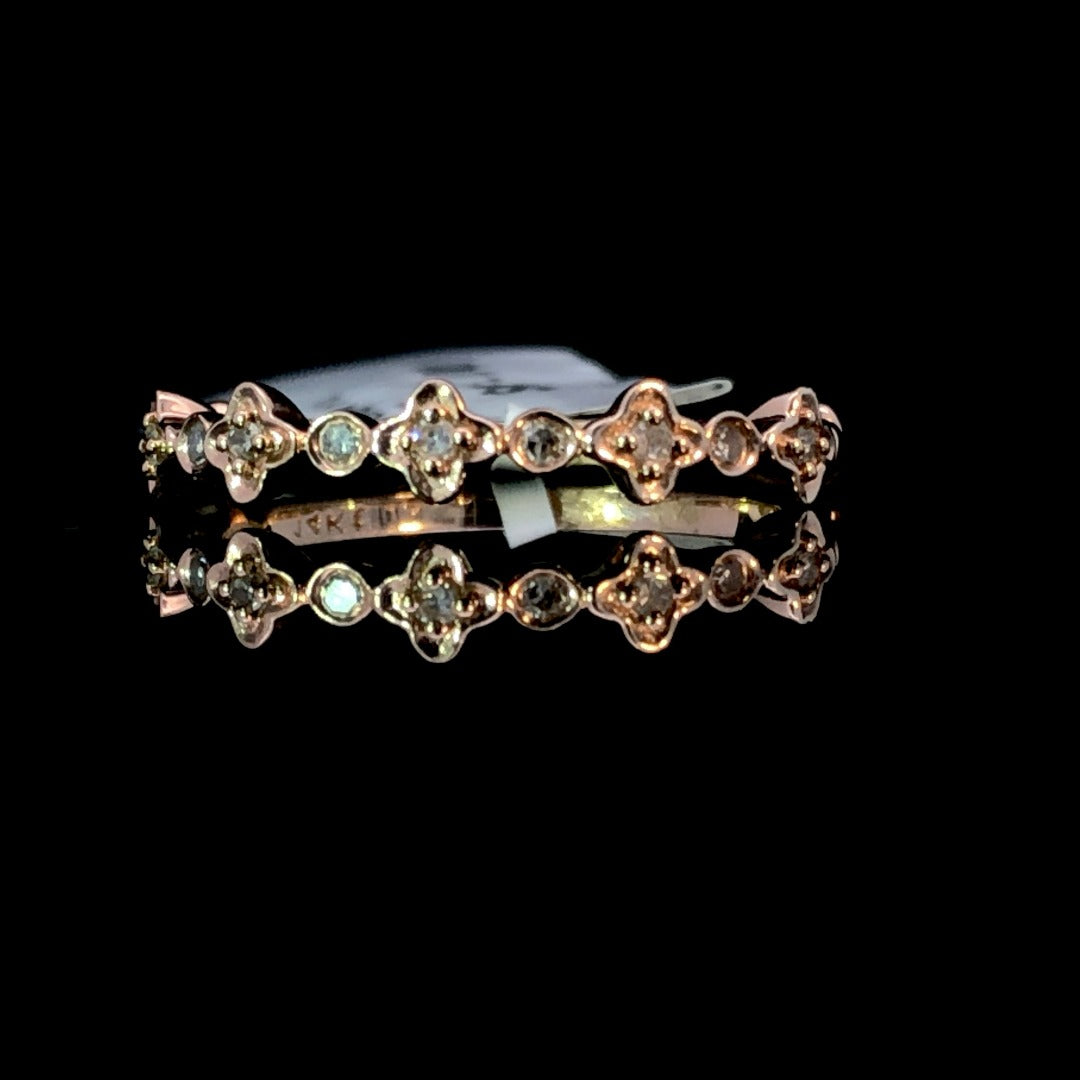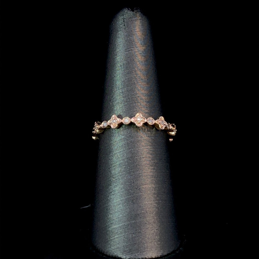 For someone who seeks a unique jewelry piece, this 14kt rose gold band features .08ctw of round diamonds set in ornamental shapes, providing an elegant, exclusive look. Its luxurious styling and tasteful design will elevate any outfit from basic to remarkable. This ring is a size 7. If that size is not a perfect fit, it can be sized up 2 sizes for free at the time of purchase. Additional sizing fees may apply.
