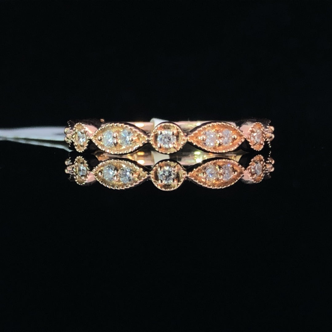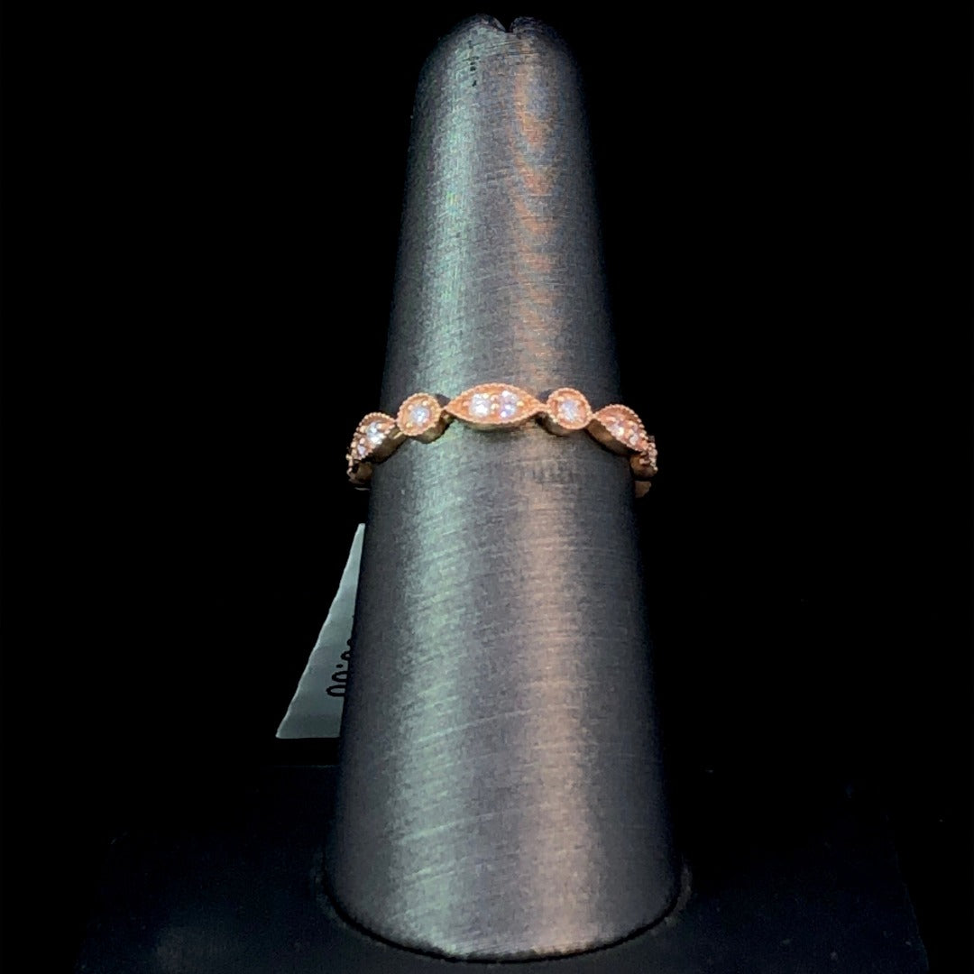 This exquisite band is crafted from luxurious 14kt rose gold, boasting an array of round diamonds artfully set in alternating shapes. Delicate milgrain detailing gives this piece a sophisticated finish and timeless appeal. With .23ctw of diamonds, this band is a stunning symbol of true love. This ring is a size 6.75. If that size is not a perfect fit, first time sizing is free at the time of purchase.