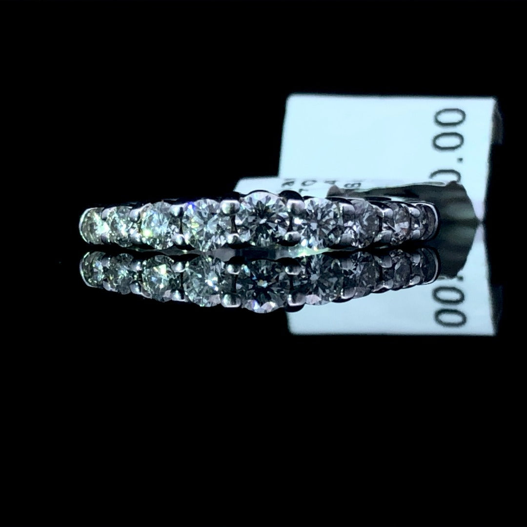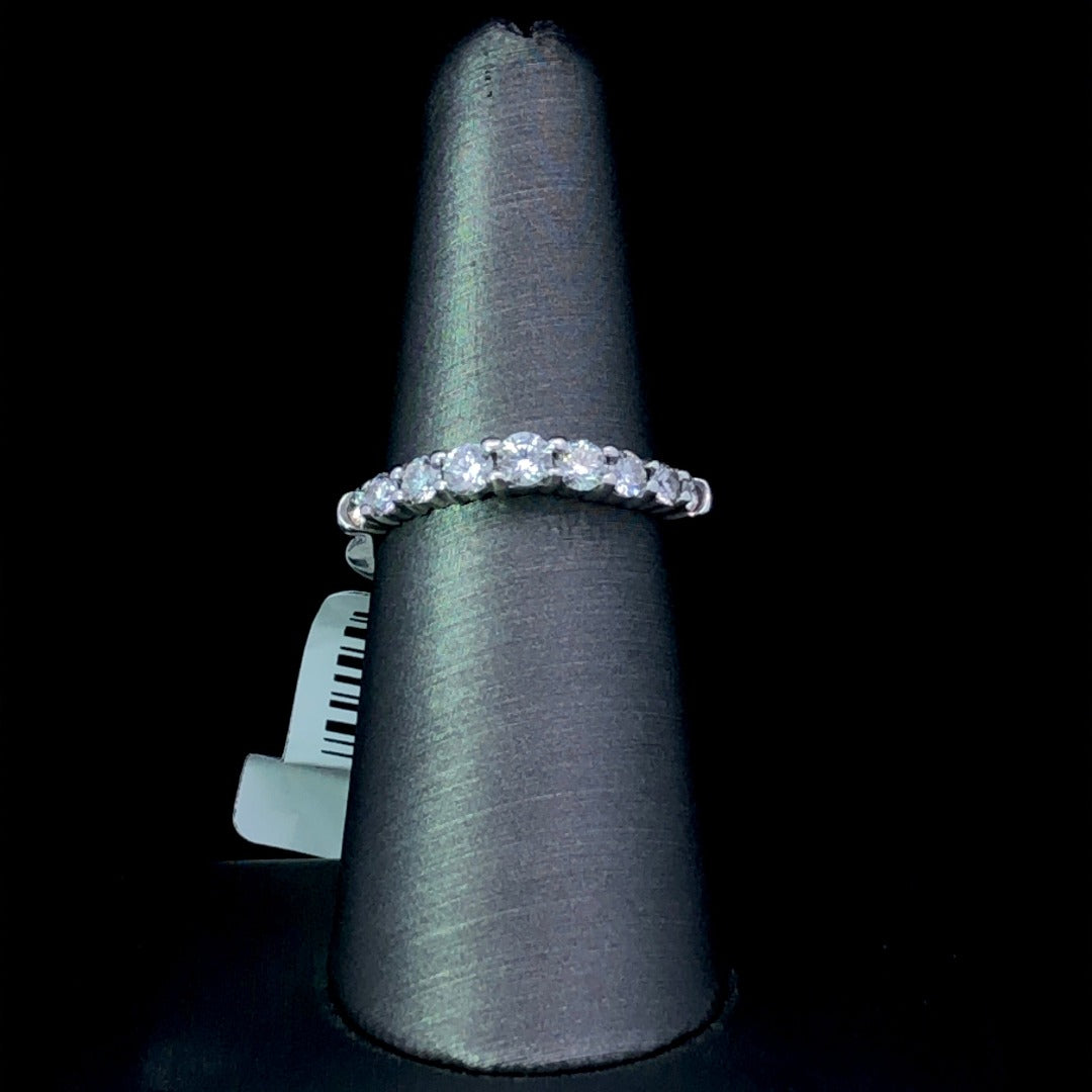 Celebrate your special day with style and opulence wearing this exquisite anniversary band. Crafted from 14kt white gold, the delicate design features .70ctw of graduating diamonds with a subtle curvature. Perfect for any special occasion, this luxurious piece exudes eternal elegance and sophistication. This ring is a size 7. If that size is not a perfect fit, first time sizing is free at the time of purchase.