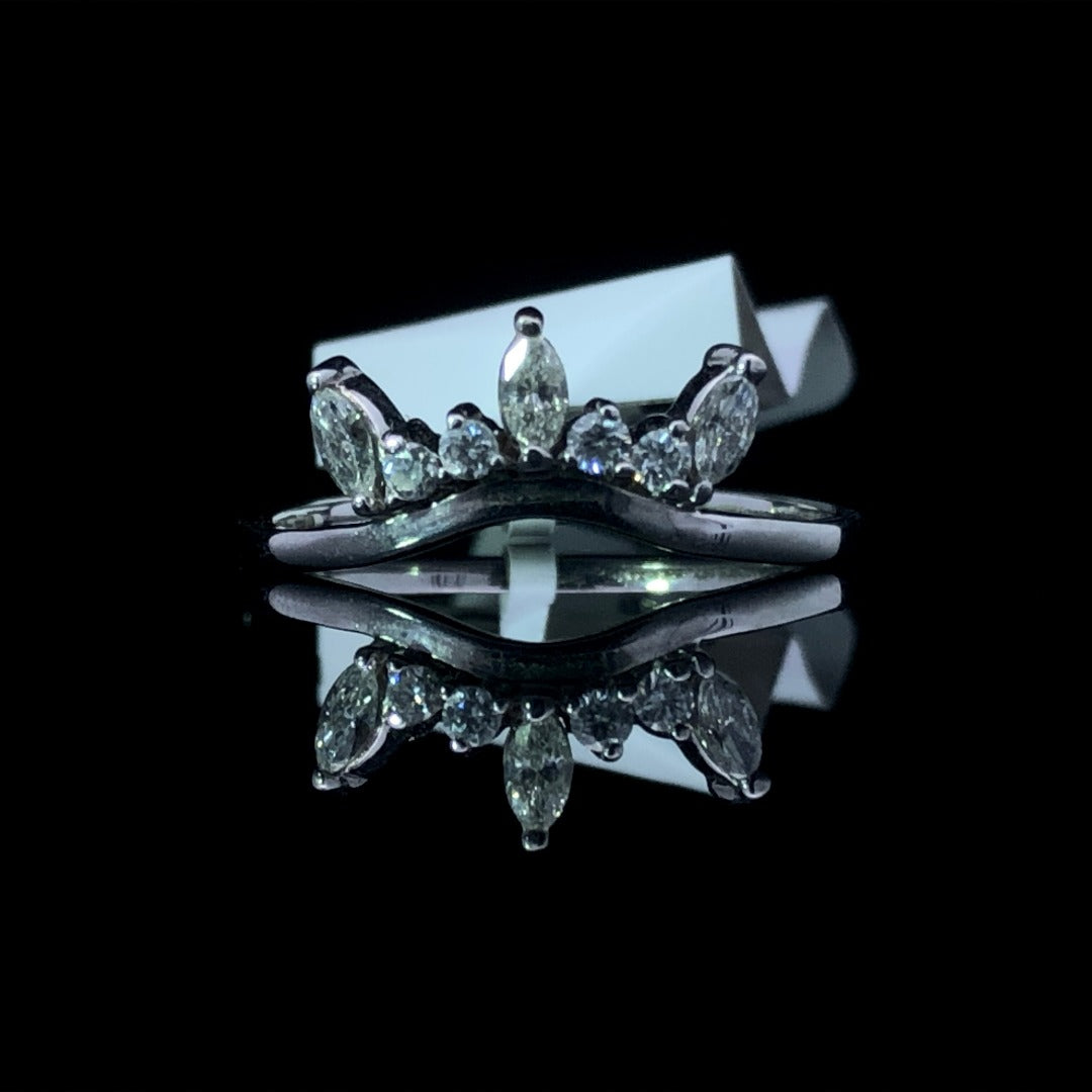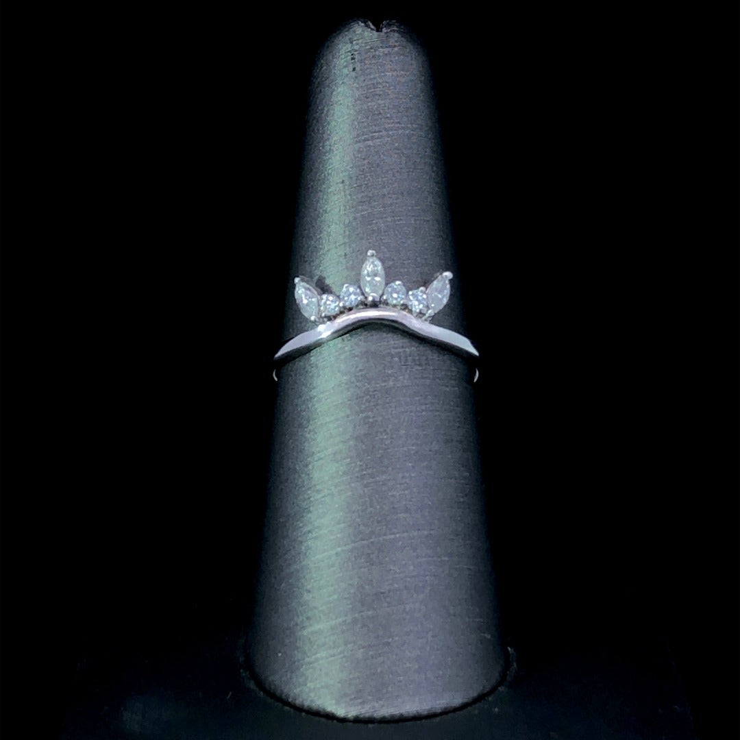 This stunning 14kt white gold curved band features .34ctw of glimmering round and marquise diamonds, artfully arranged to add a special touch of sparkle to your set. Splendidly crafted to give a sophisticated, exclusive look, this subtle yet eye-catching band is a must-have for any luxury jewelry collection. This ring is a size 7. If that size is not a perfect fit, first time sizing is free at the time of purchase.