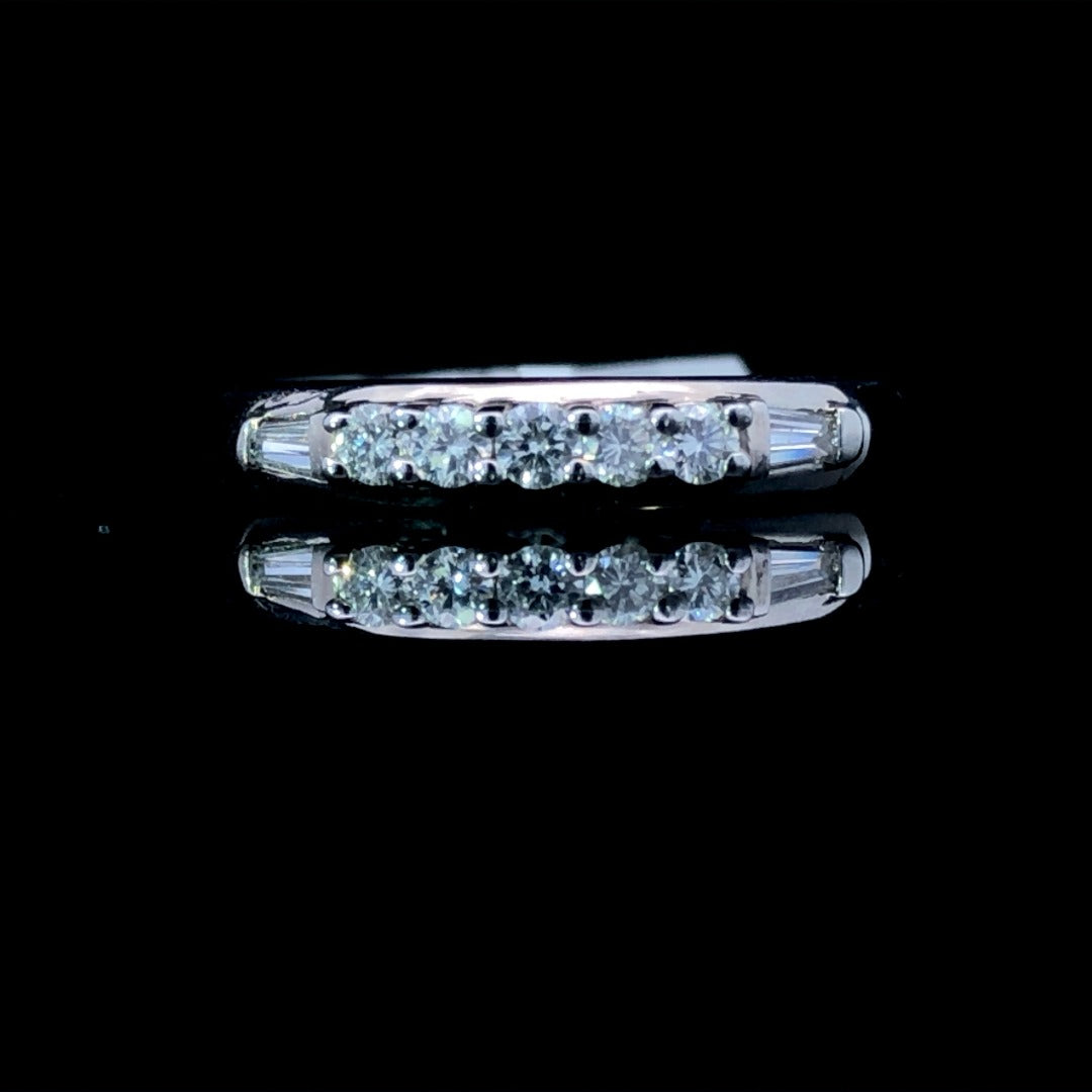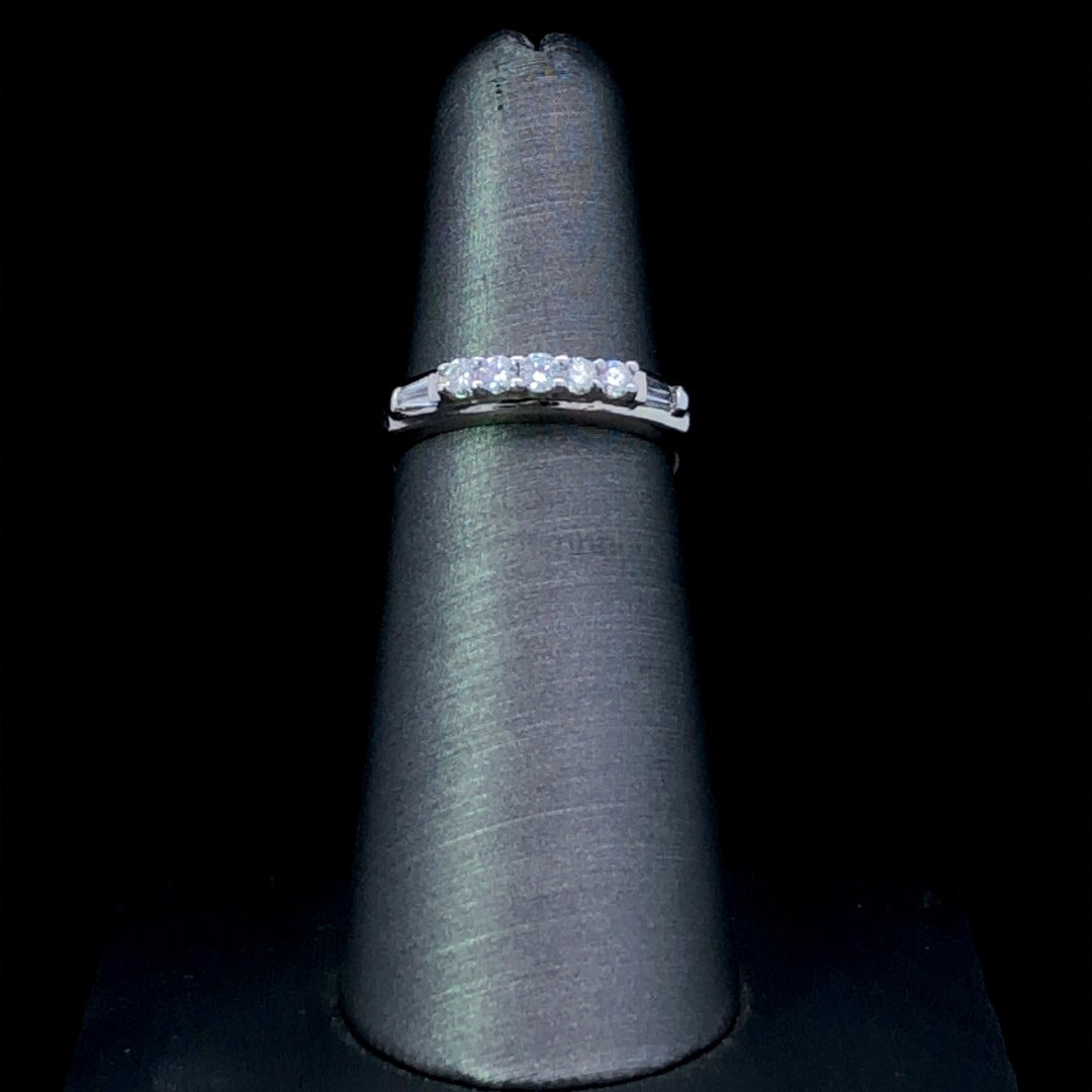 Celebrate your special day with this exquisite anniversary band. Crafted in luxurious 14K white gold, it highlights a stunning array of intricately cut stones, including five round and two baguette diamonds, totaling 0.28ctw. Elegant and refined, this piece offers a timeless, luxurious accent that you are sure to treasure for years to come. This ring is a size 5.25. If that size is not a perfect fit, first time sizing is free at the time of purchase.