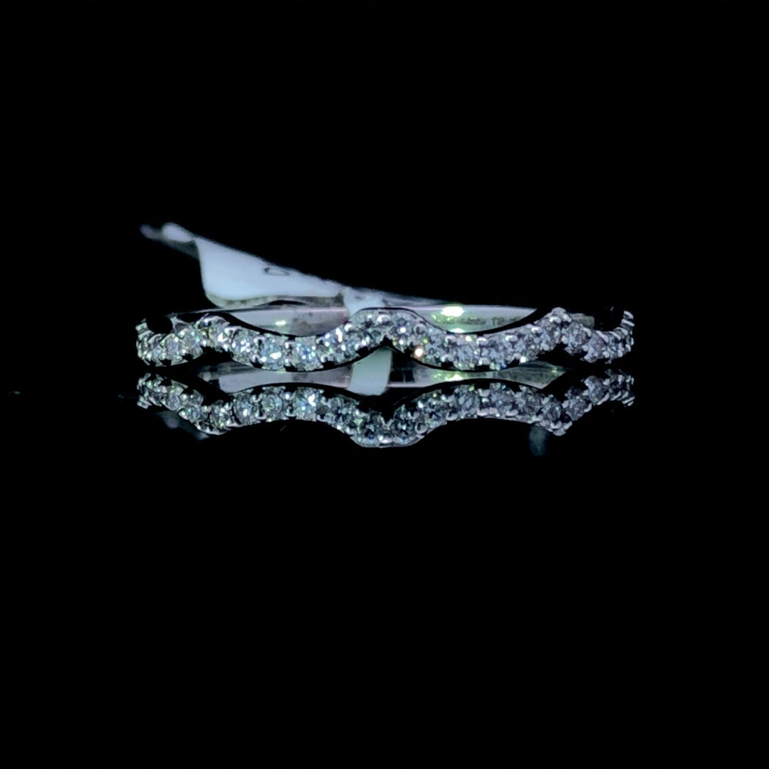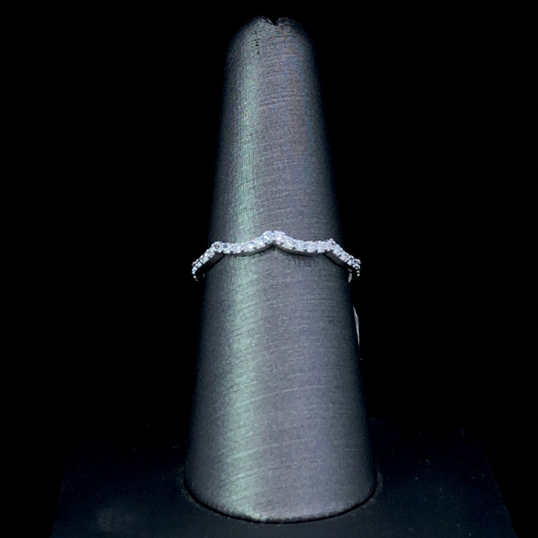 This exquisite 14kt white gold anniversary band, with its gentle curves set with .20ctw of round diamonds, is the perfect way to add a touch of luxury to your engagement ring. Celebrate your special day in sophisticated style with a band that makes a statement, crafted to perfectly match the unique curvatures of your beautiful engagement ring. This ring is a size 7. If that size is not a perfect fit, first time sizing is free at the time of purchase.