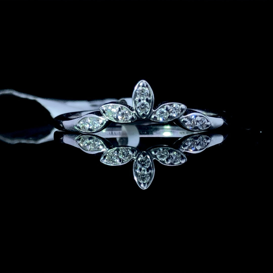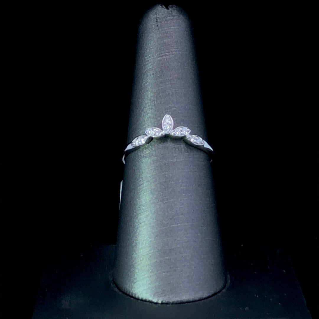 This stunning anniversary band is the perfect way to commemorate a milestone. Expertly crafted from 14kt white gold, it is adorned with .10ctw of round diamonds set in an elegant, detailed design. A symbol of lasting love and devotion, this anniversary band will radiate with beauty for years to come. This ring is a size 7. If that size is not a perfect fit, first time sizing is free at the time of purchase.