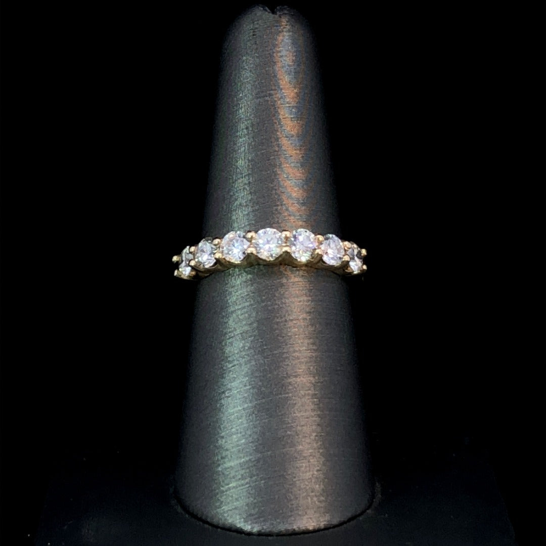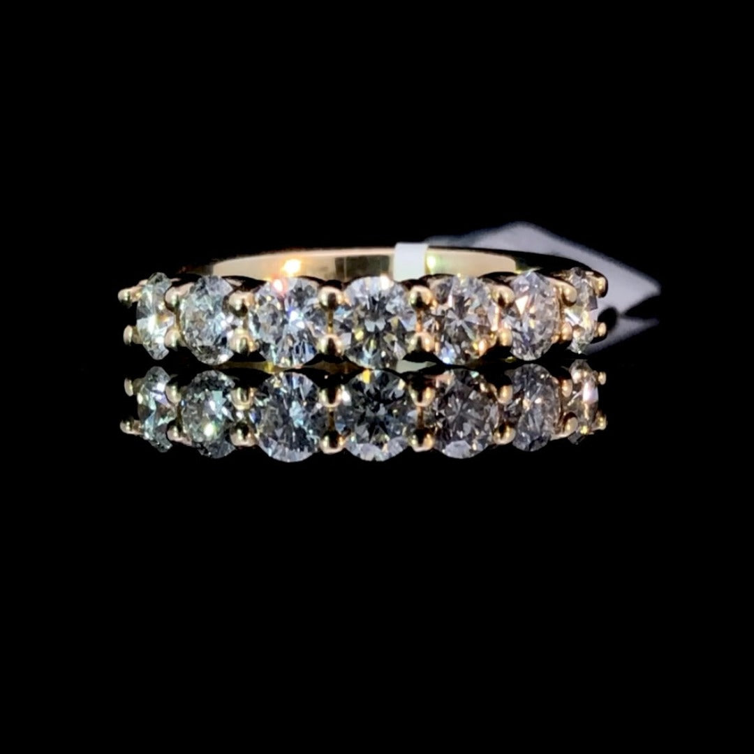 This exquisite diamond anniversary band is crafted from 14 karat yellow gold, featuring 1.30ctw of luminous round diamonds, shimmering with sophistication and glamour, sure to make a statement for generations to come. This ring is a size 7.25. If that size is not a perfect fit, first time sizing is free at the time of purchase.