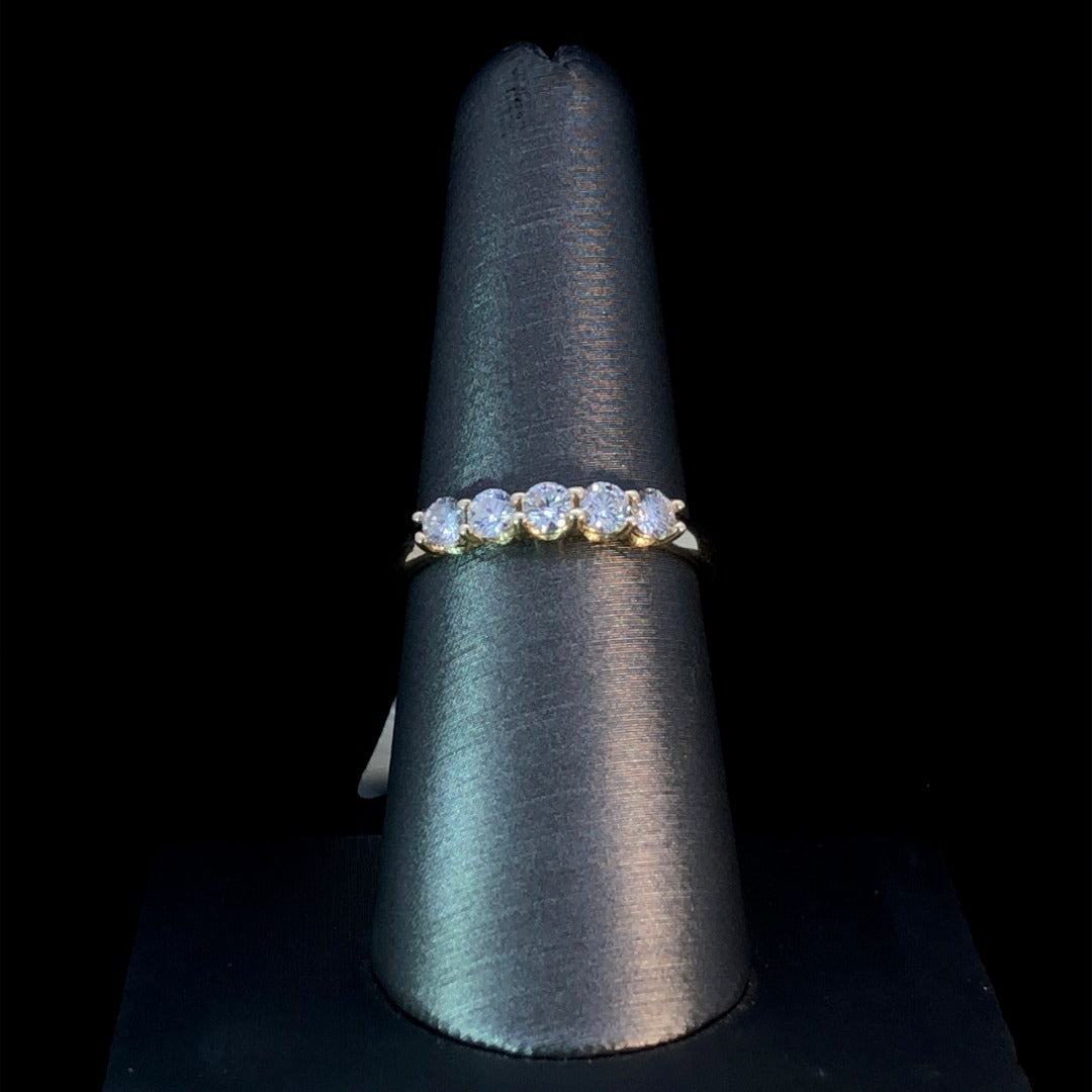 Elevate your look with this timeless 14kt yellow gold shared prong diamond ring. Adorned by a beautiful selection of .55ctw of round diamonds, this piece of sophisticated jewelry radiates an air of elegance and luxury, offering a captivating sparkle that will bring an extra touch of sophistication to any ensemble. This ring is a size 7.75. If that size is not a perfect fit, first time sizing is free at the time of purchase.