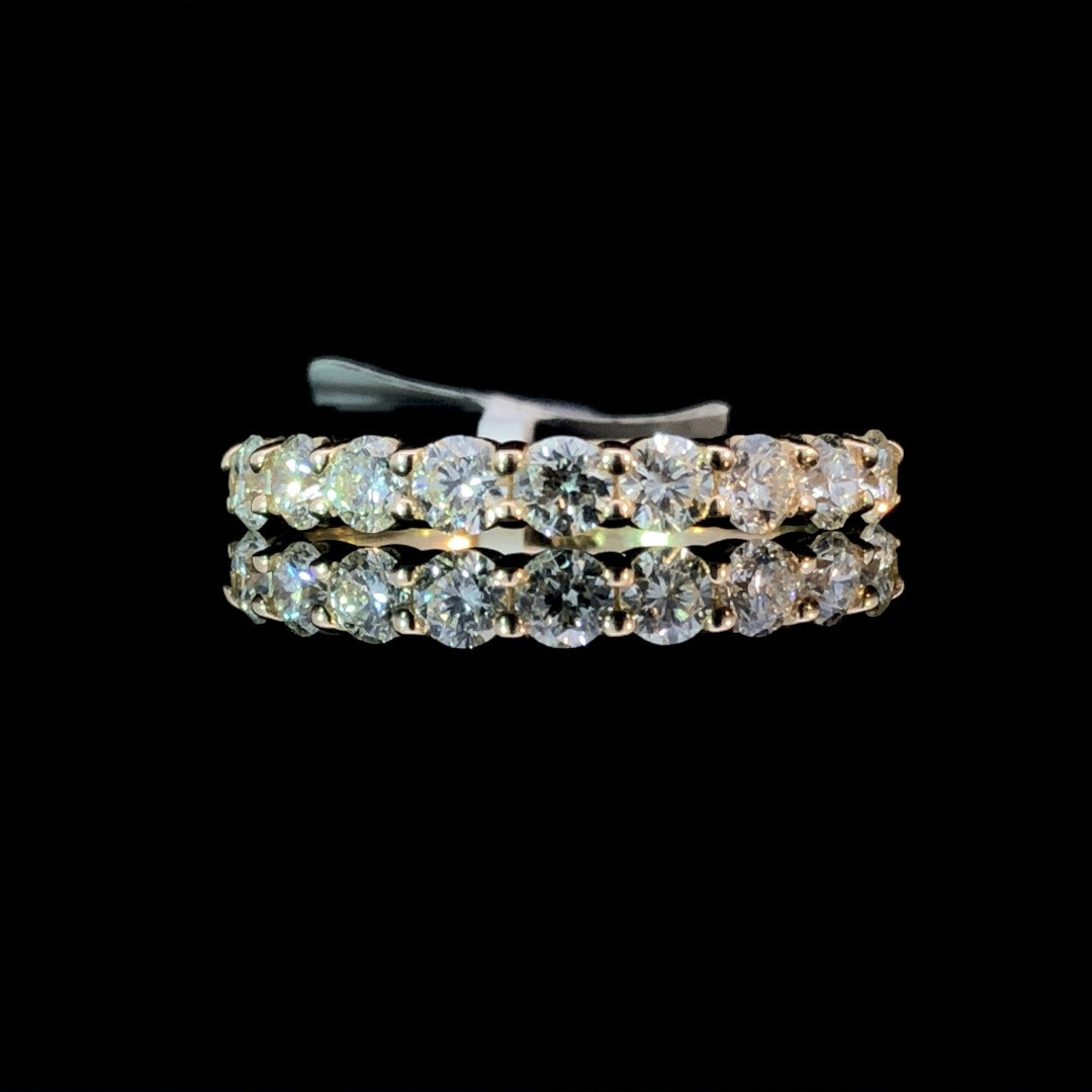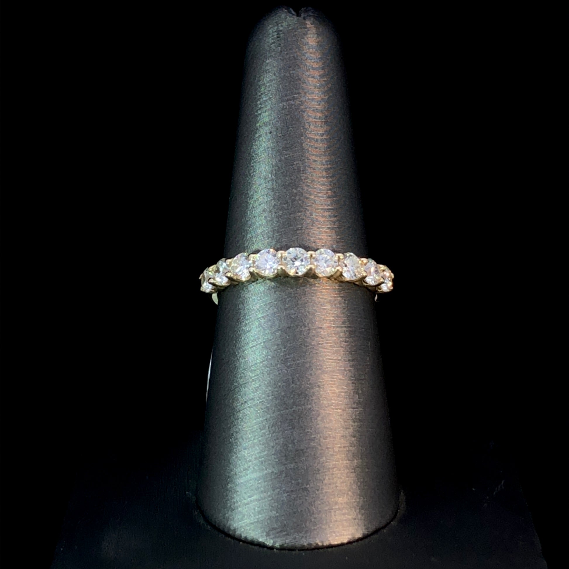Not just an anniversary ring, but a timeless symbol of love and devotion that will dazzle you with its mesmerizing beauty for decades to come. This classic 14kt yellow gold band flickers with 1.00ctw of round diamonds, artfully prong-set for maximum sparkle. Make it your forever-lasting symbol of your undying commitment. This ring is a size 7.5. If that size is not a perfect fit, first time sizing is free at the time of purchase.