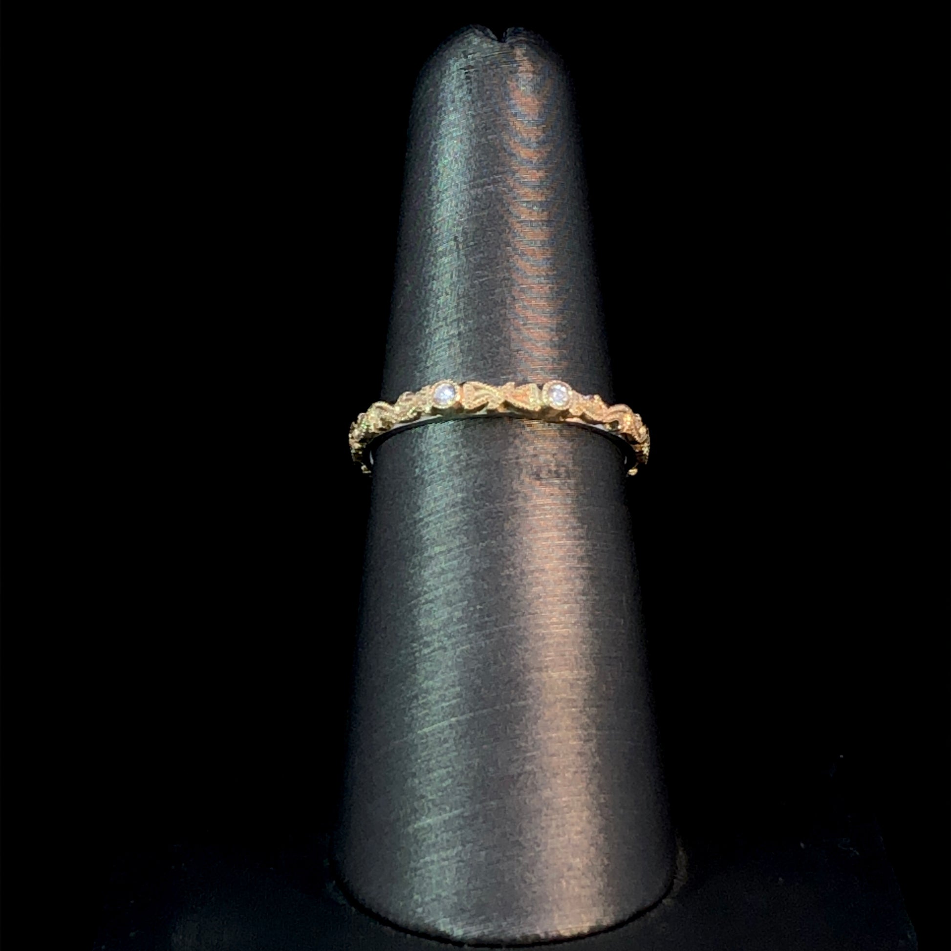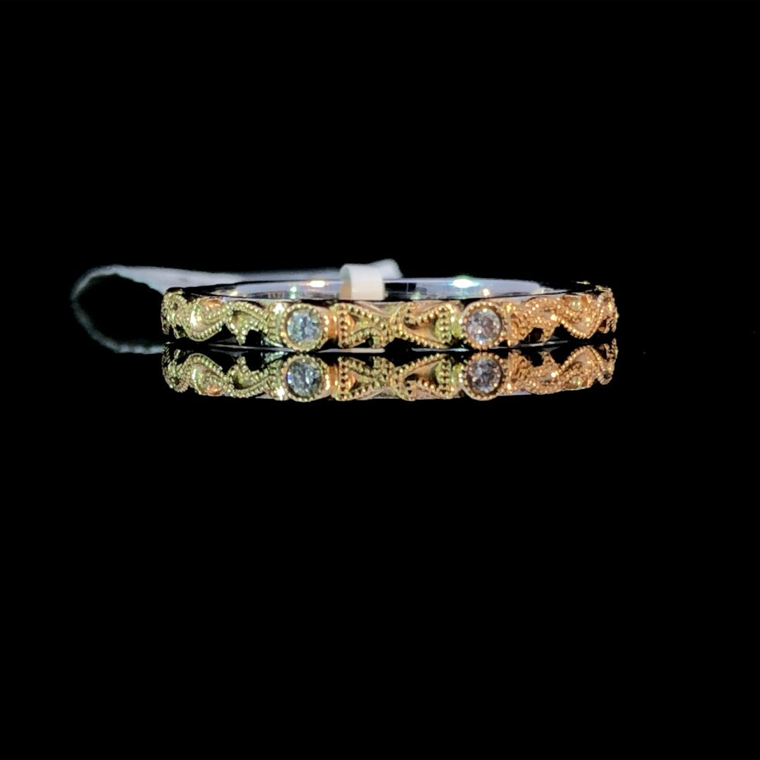 This exquisite ring offers a subtle hint of sparkle with two diamonds totaling .03ctw, elegantly set in 2 tone 14kt gold with intricate etching and migrain details. A perfect balance of sophistication and elegance, the ring is crafted with a white gold base, making it the ultimate statement of luxury. This ring is a size 6.5. If that size is not a perfect fit, first time sizing is free at the time of purchase.