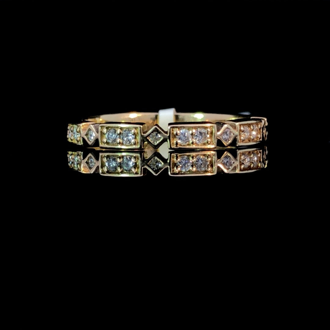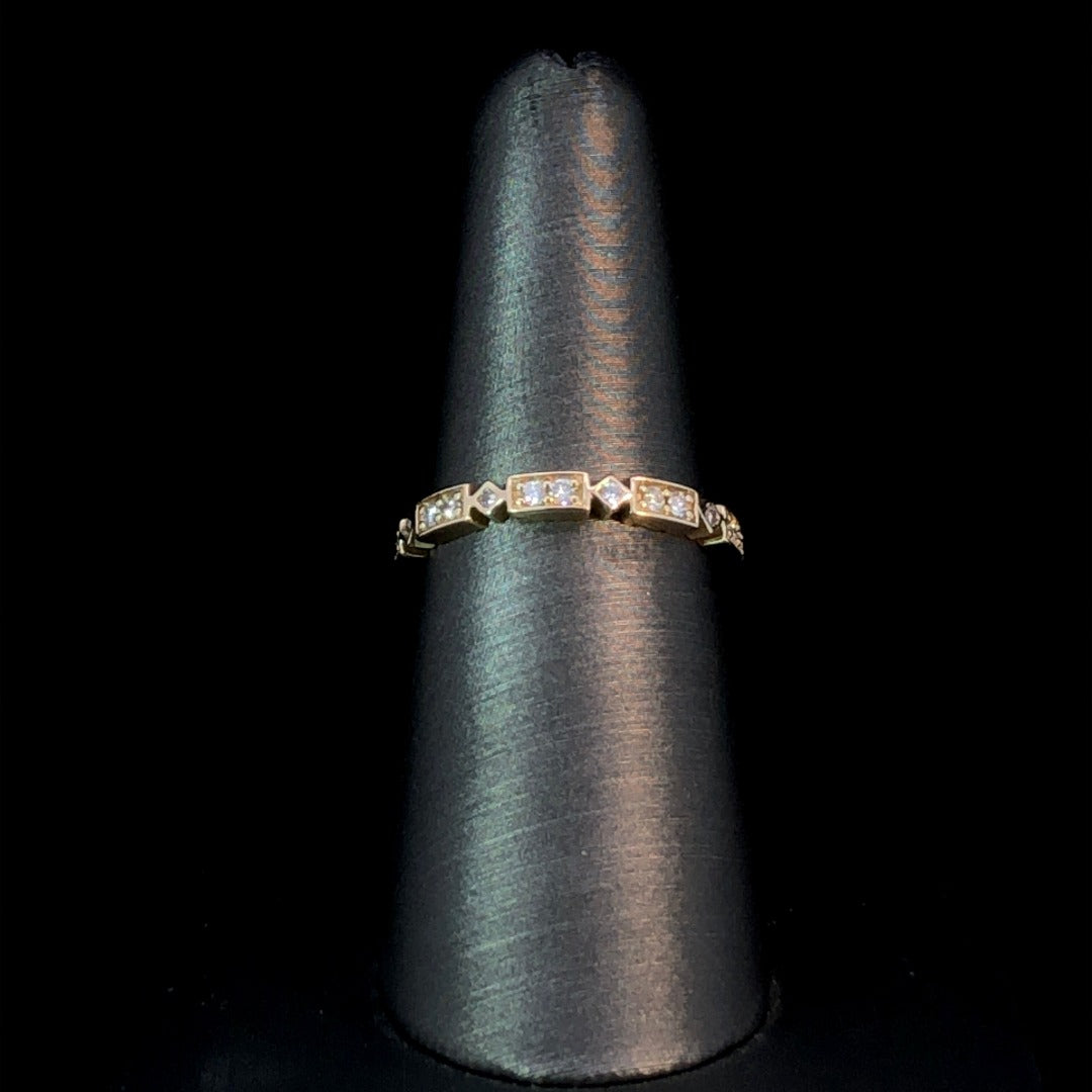 Adorned with .19ctw of round diamonds in alternating patterns, this 14kt yellow gold band is a true masterpiece for those seeking a royal, ornate accessory. The unique design adds an elegant, tasteful finish to any look. This ring is a size 7. If that size is not a perfect fit, first time sizing is free at the time of purchase.