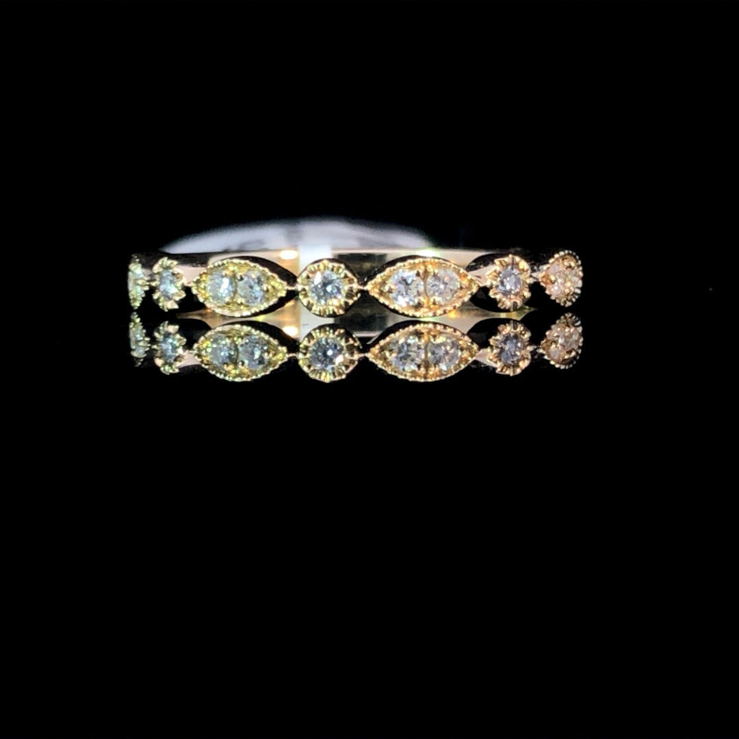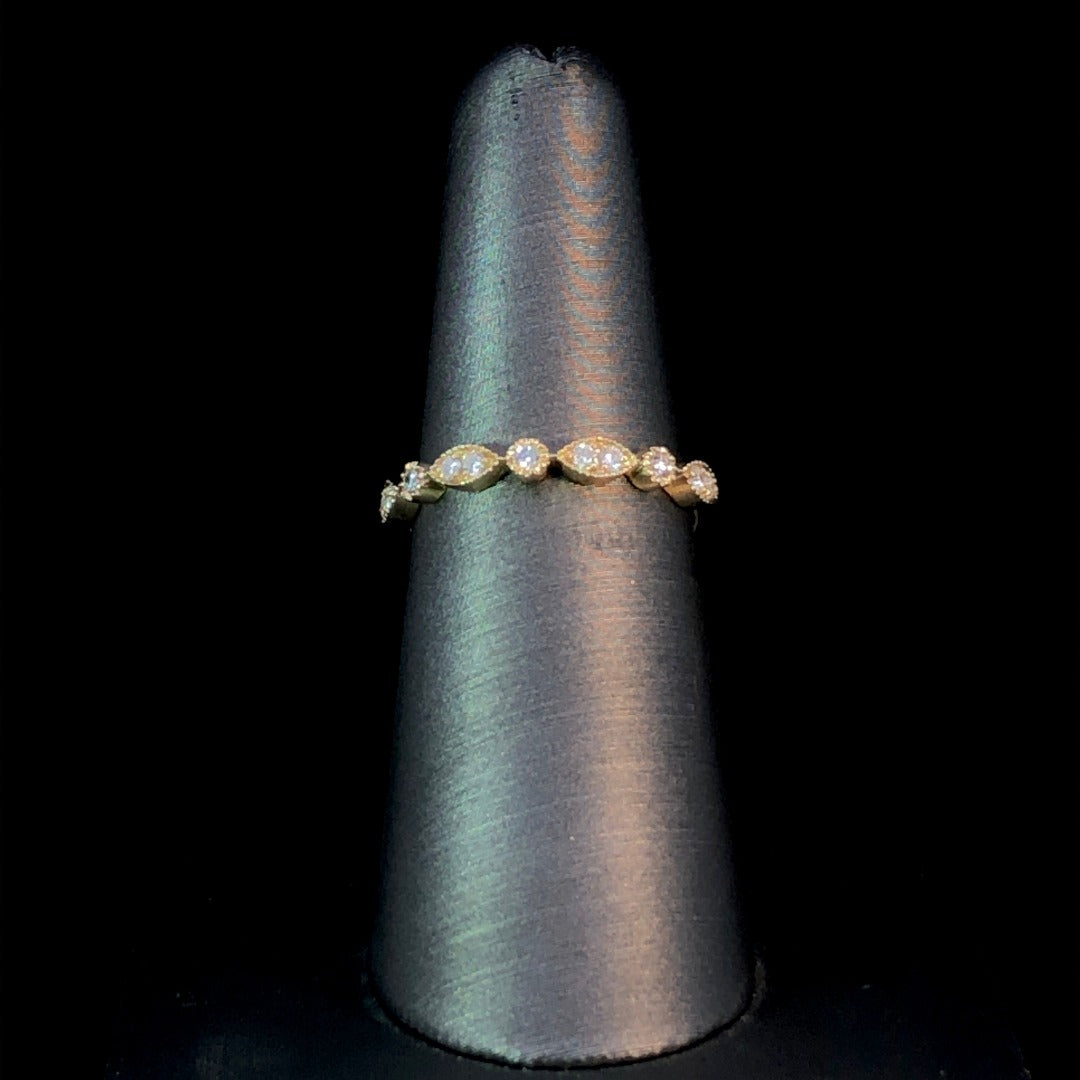 This stylish band features an alternating sequence of two timeless shapes – 0.16ctw of round brilliant diamonds, set in a round and marquise pattern, with a touch of milgrain detailing on a 14kt yellow gold band. Show off your exquisite taste with this perfect addition to your jewelry collection. This ring is a size 6.5. If that size is not a perfect fit, first time sizing is free at the time of purchase.