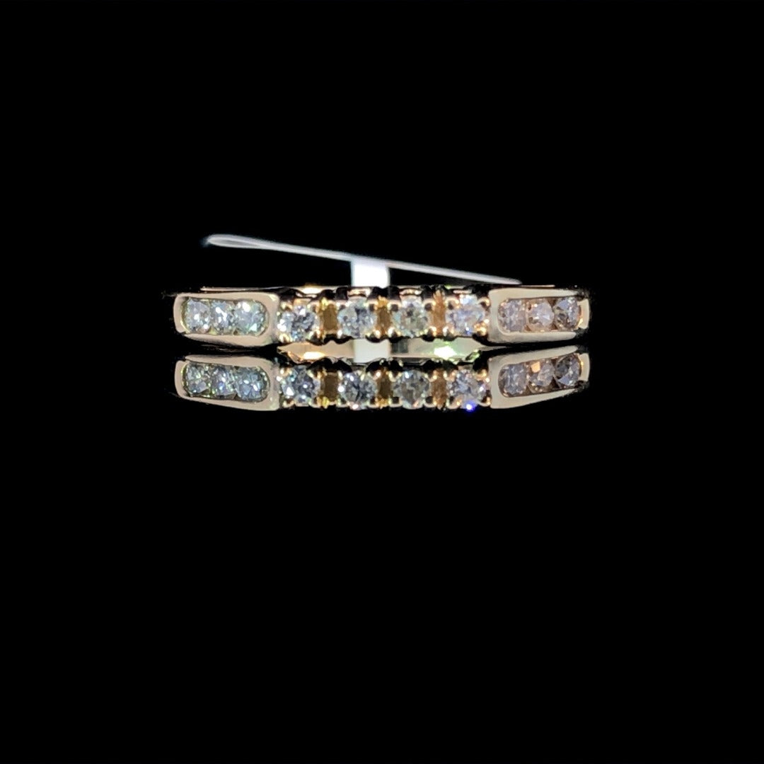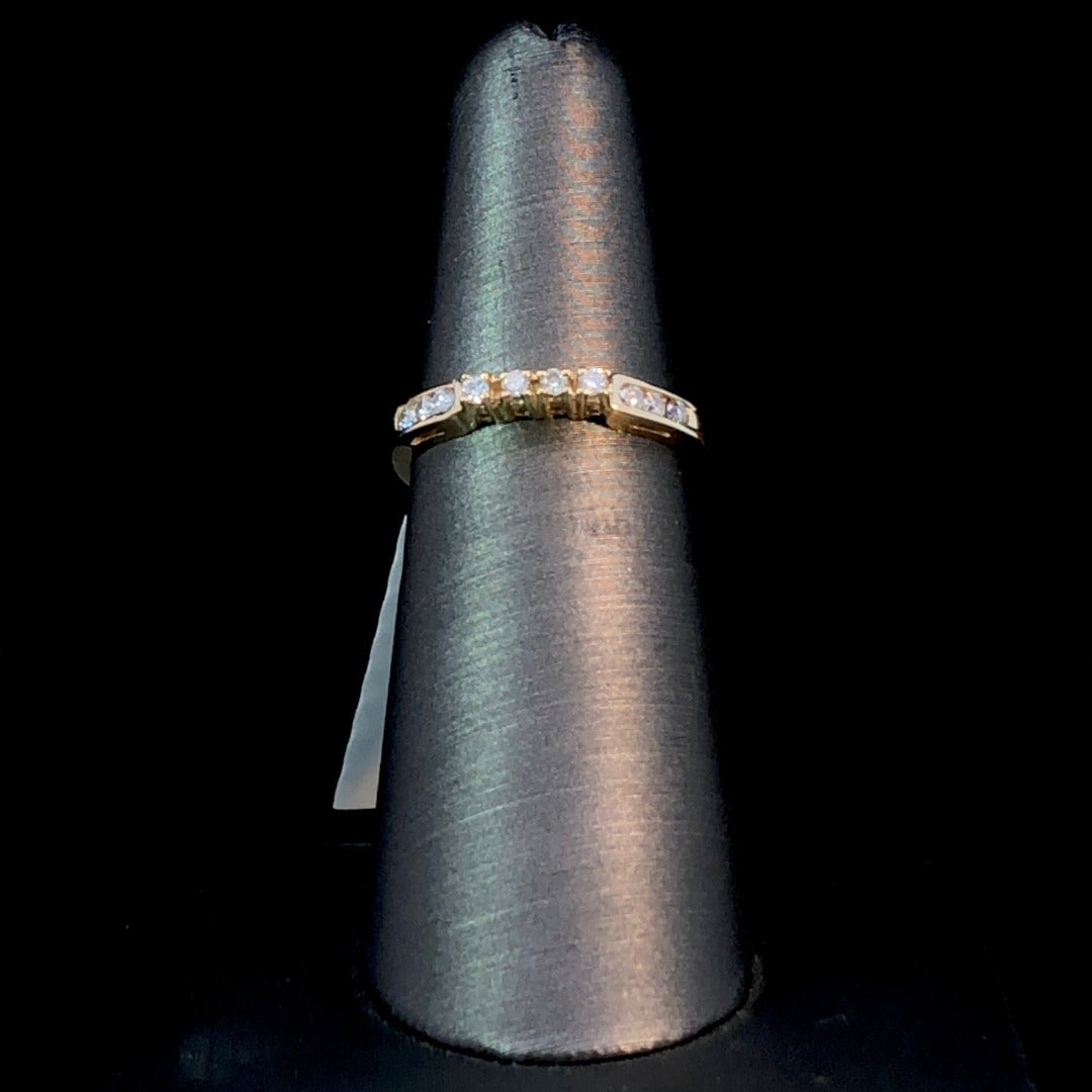 This modern 14kt yellow gold anniversary band makes a perfect token of lasting commitment. Expertly crafted, it features .21ctw of round diamonds expertly placed, with four center diamonds prong set, and three channel set diamonds on each side. A subtle yet sparkling addition to any jewelry collection, let this unique band remind you of your long-lasting devotion. This ring is a size 5.75. If that size is not a perfect fit, first time sizing is free at the time of purchase.