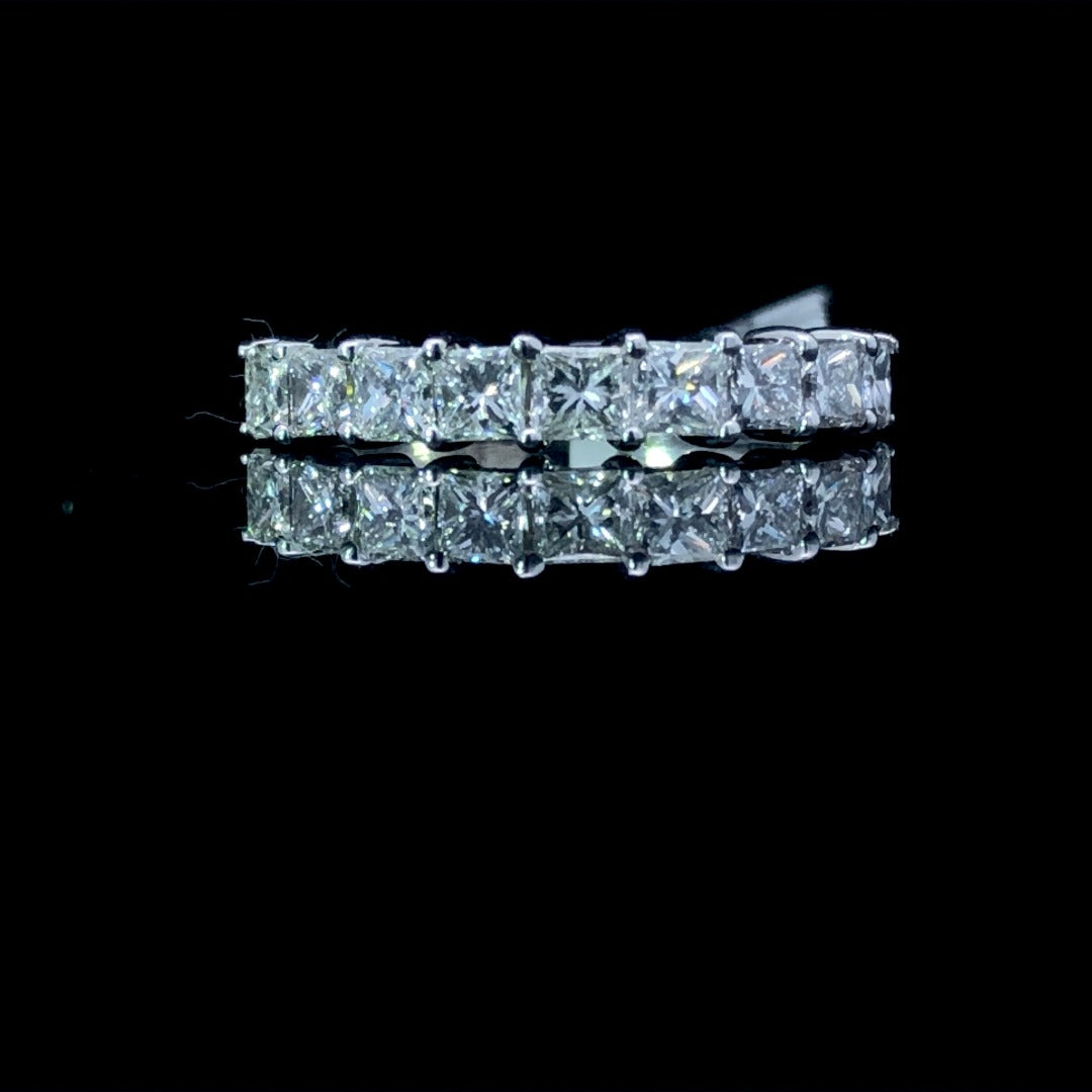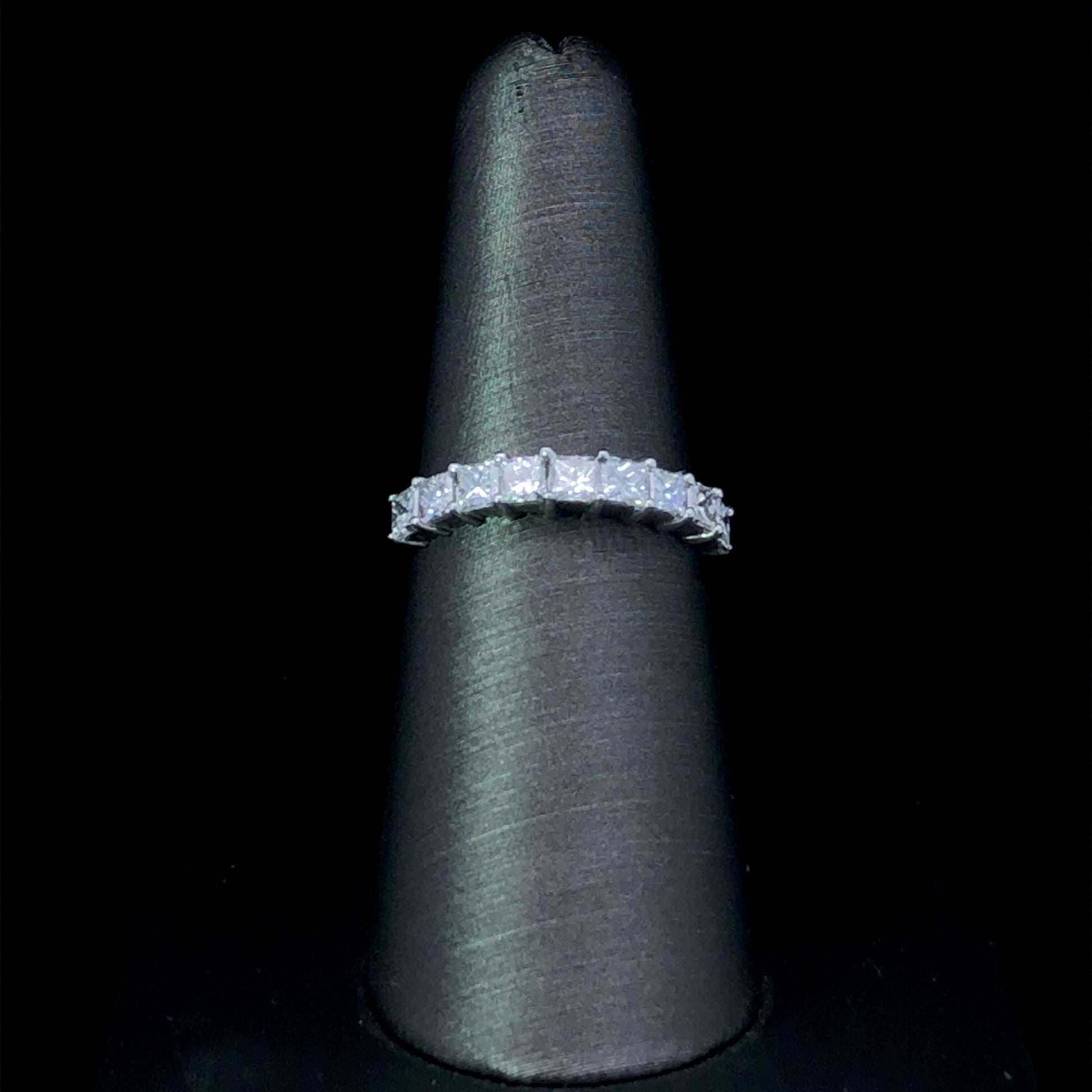 This elegant diamond anniversary band is crafted in 14kt white gold and embellished with 1.08ctw of dazzling princess cut diamonds, perfect for commemorating an everlasting commitment of love. Richly detailed and shimmering with exquisite sparkle, this timeless design exudes tasteful luxury. This ring is a size 7. If that size is not a perfect fit, first time sizing is free at the time of purchase. Additional sizing fees may apply.