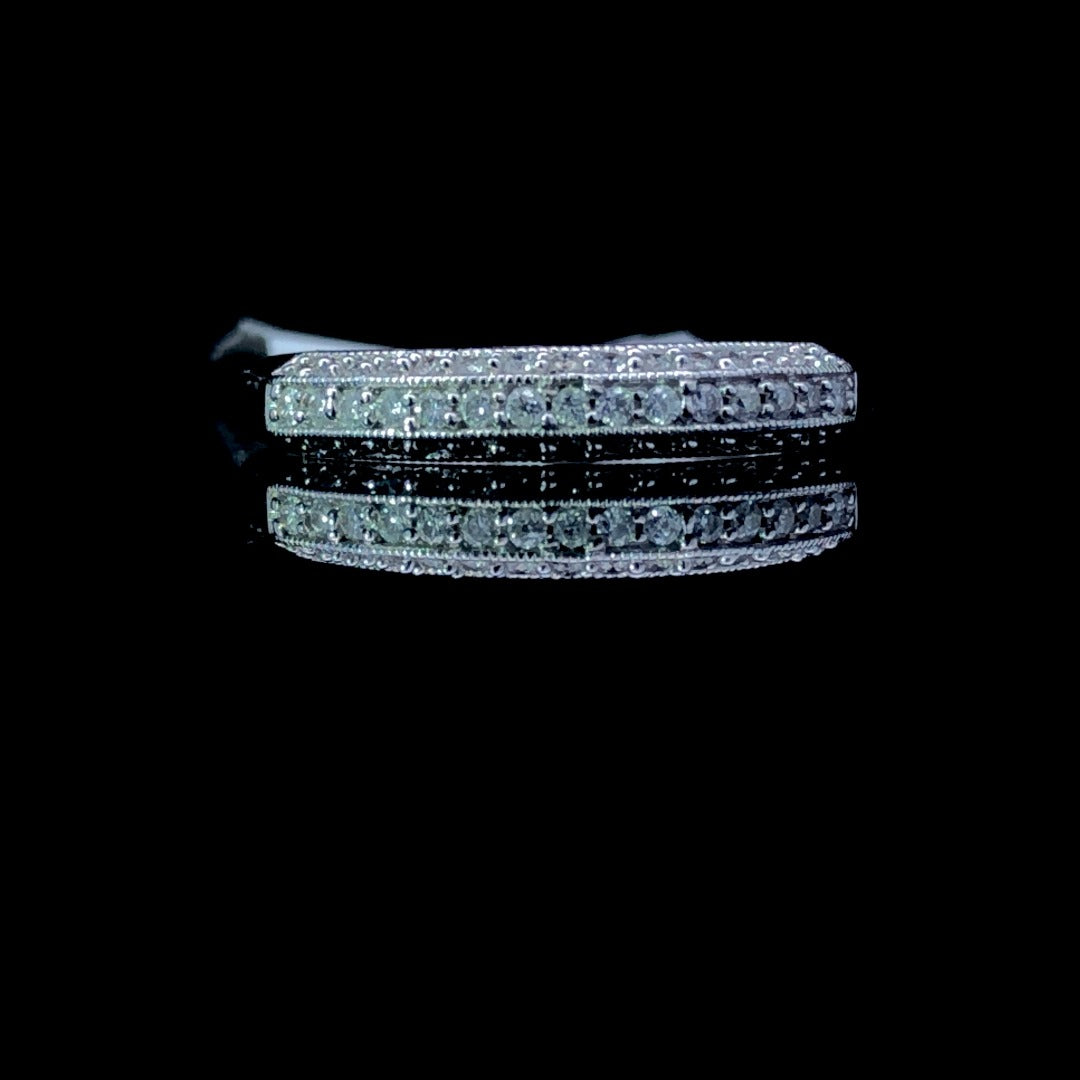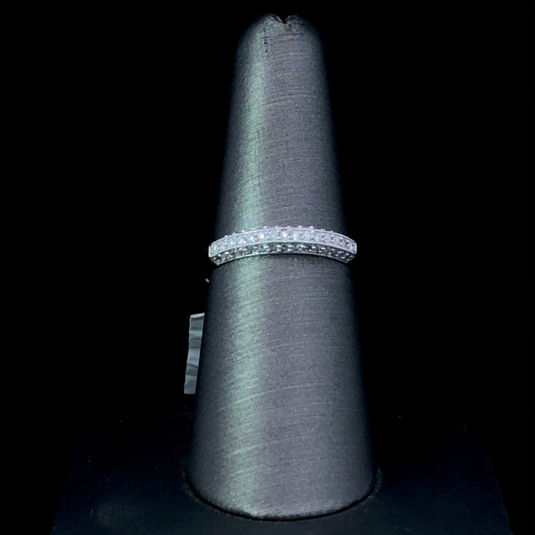 This luxurious diamond band is a stunning show of style and sophistication. Crafted from brilliant 14kt white gold, it's set with 0.25ctw of round diamonds along the front, back, and top, each separated by elegant milgrain detailing. Own a piece of true beauty and express your style with this dazzling diamond band. This ring is a size 7. If that size is not a perfect fit, first time sizing is free at the time of purchase.
