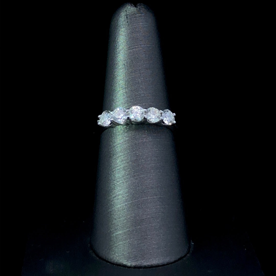 This stunning diamond band exudes timeless elegance. Five exquisite round diamonds totaling .98ctw are set in a 14kt white gold band, bringing you a piece of sophisticated jewelry that will sparkle forever. Capture the beauty of love with this classic diamond band! This ring is a size 7. If that size is not a perfect fit, first time sizing is free at the time of purchase.