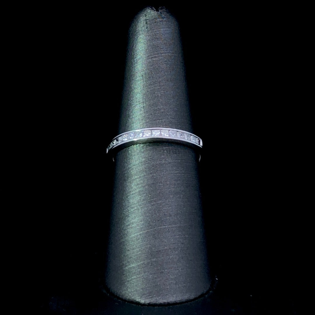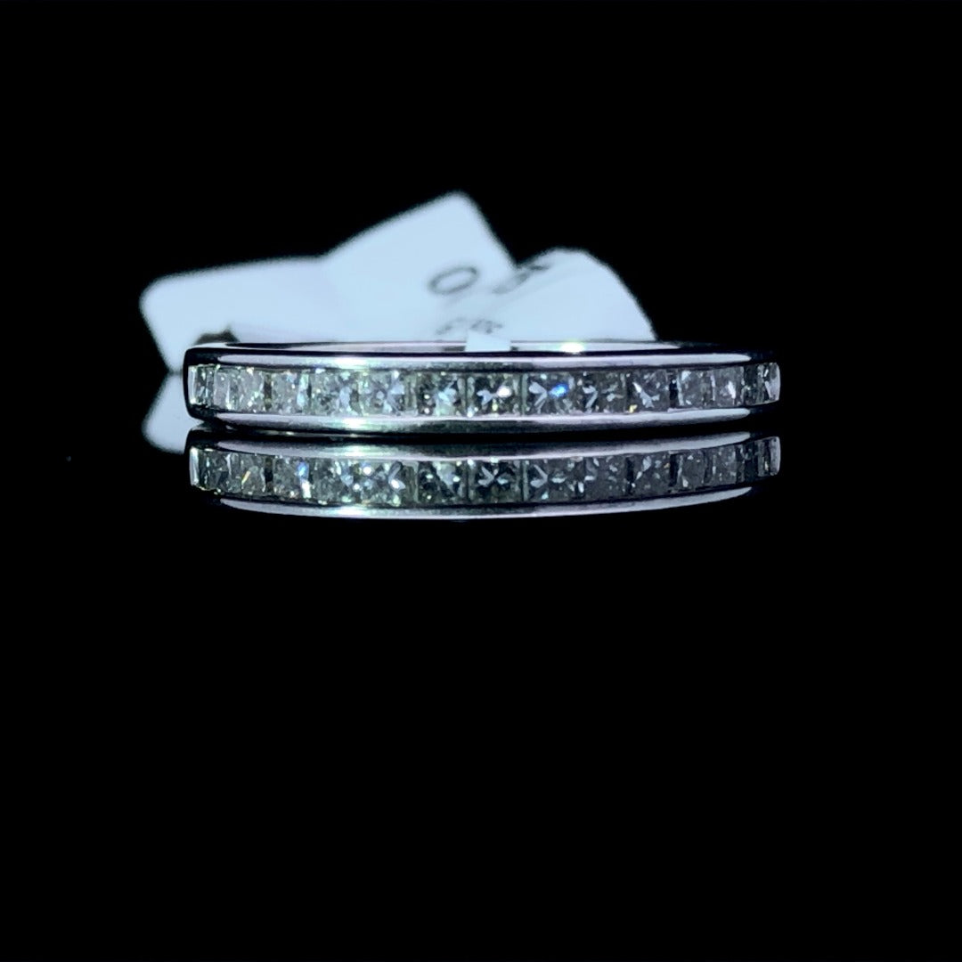 Glimmering with effortless elegance, this diamond band features .30ctw of princess cut diamonds set in a gleaming 14kt white gold setting. It's a stunning symbol of timeless beauty. This ring is a size 6.5. If that size is not a perfect fit, first time sizing is free at the time of purchase.