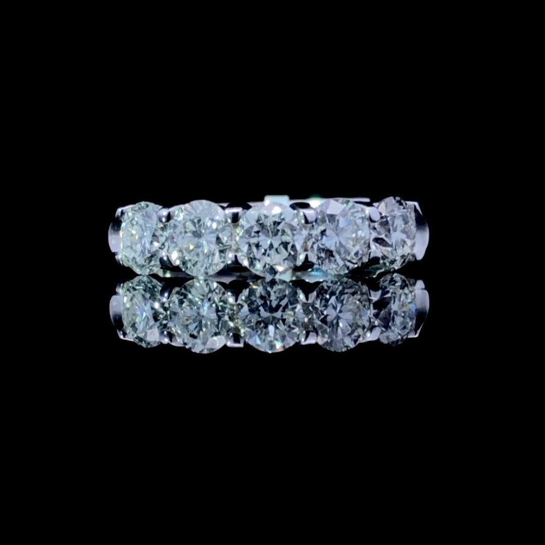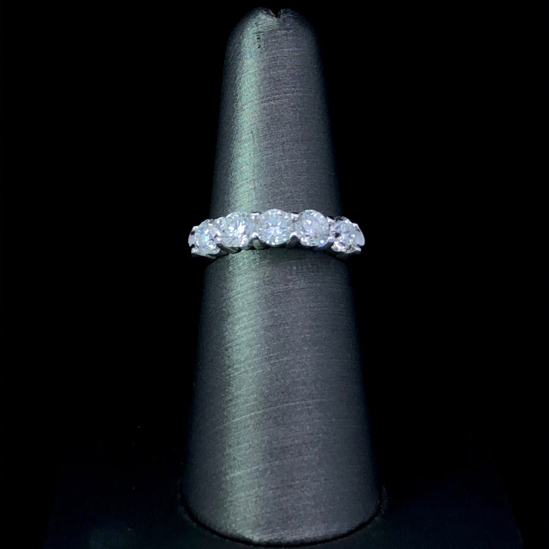 Show your timeless style with this modern classic-- the 14k white gold band set with five extraordinary diamonds totaling 1.50ctw. Can you say sparkle? This diamond band is sure to shine in any light, giving you a showstopping look perfect for any occasion. This ring is a size 6.75. If that size is not a perfect fit, first time sizing is free at the time of purchase. Additional sizing fees may apply.