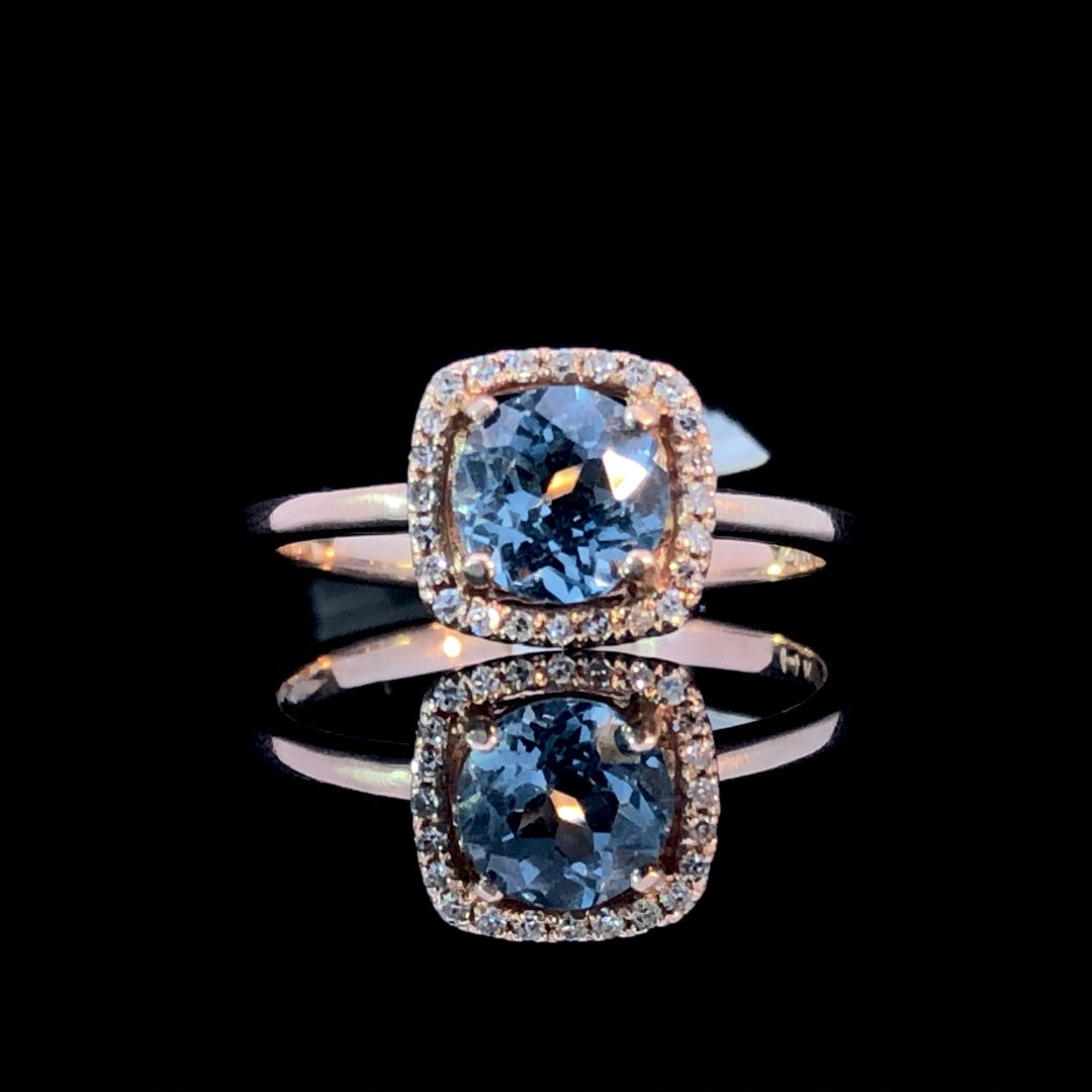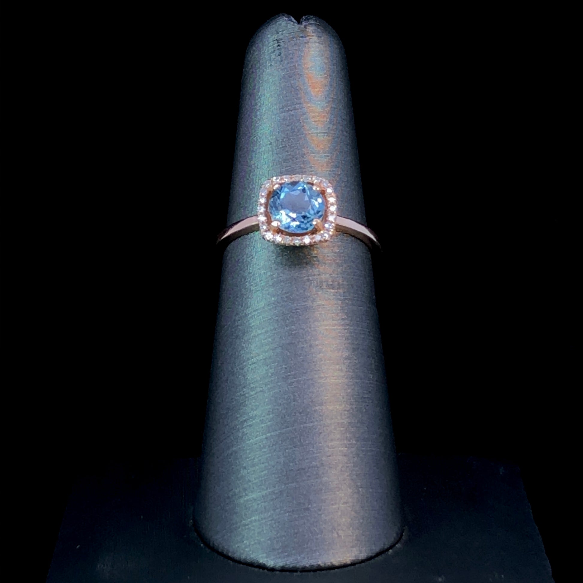 Exquisite and elegant, this captivating ring is carefully crafted to create a timeless look. Adorned with a luminous 1.05ct round blue topaz center, set in a luminous .07ctw diamond halo, and finished in 14kt rose gold, it radiates with opulent flair. Make this luxurious piece yours and be the envy of all. This ring is a size 6. If that size is not a perfect fit, first time sizing is free at the time of purchase. Additional sizing fees may apply.