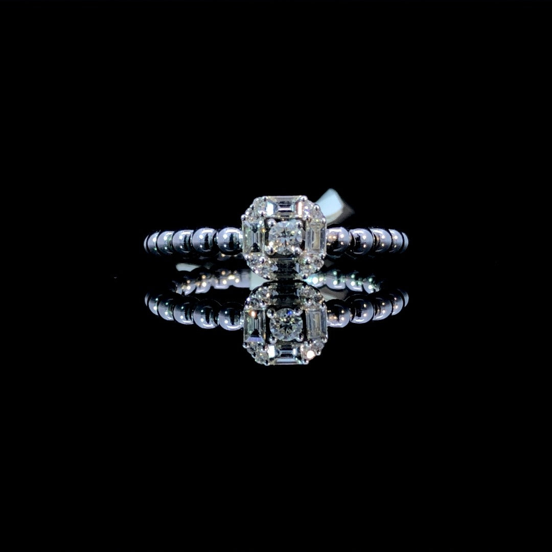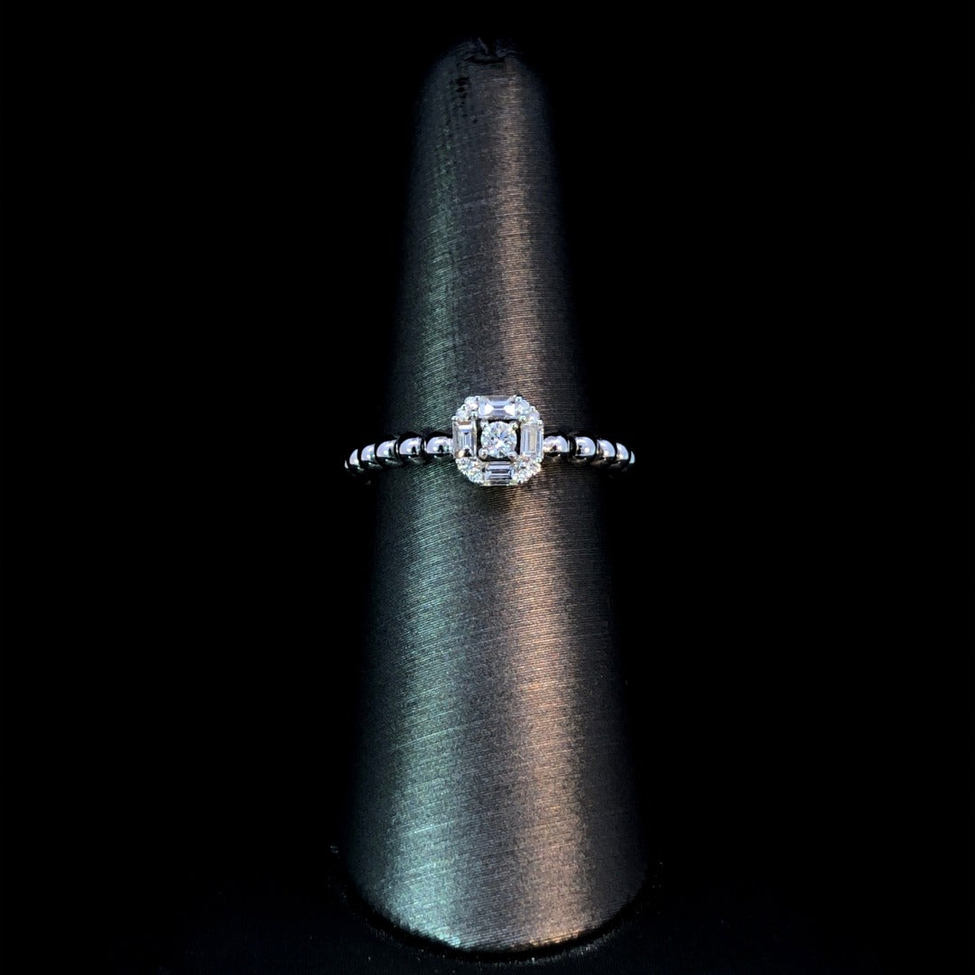 Exquisitely elegant, this 14kt white gold ring is the perfect choice for a sophisticated everyday accessory. Boasting a chic beaded band, it features a mesmerizing cluster of round and baguette diamonds totaling .30ctw that radiates timeless allure and refined sparkle. This ring is a size 7. If that size is not a perfect fit, first time sizing is free at the time of purchase. Additional sizing fees may apply.