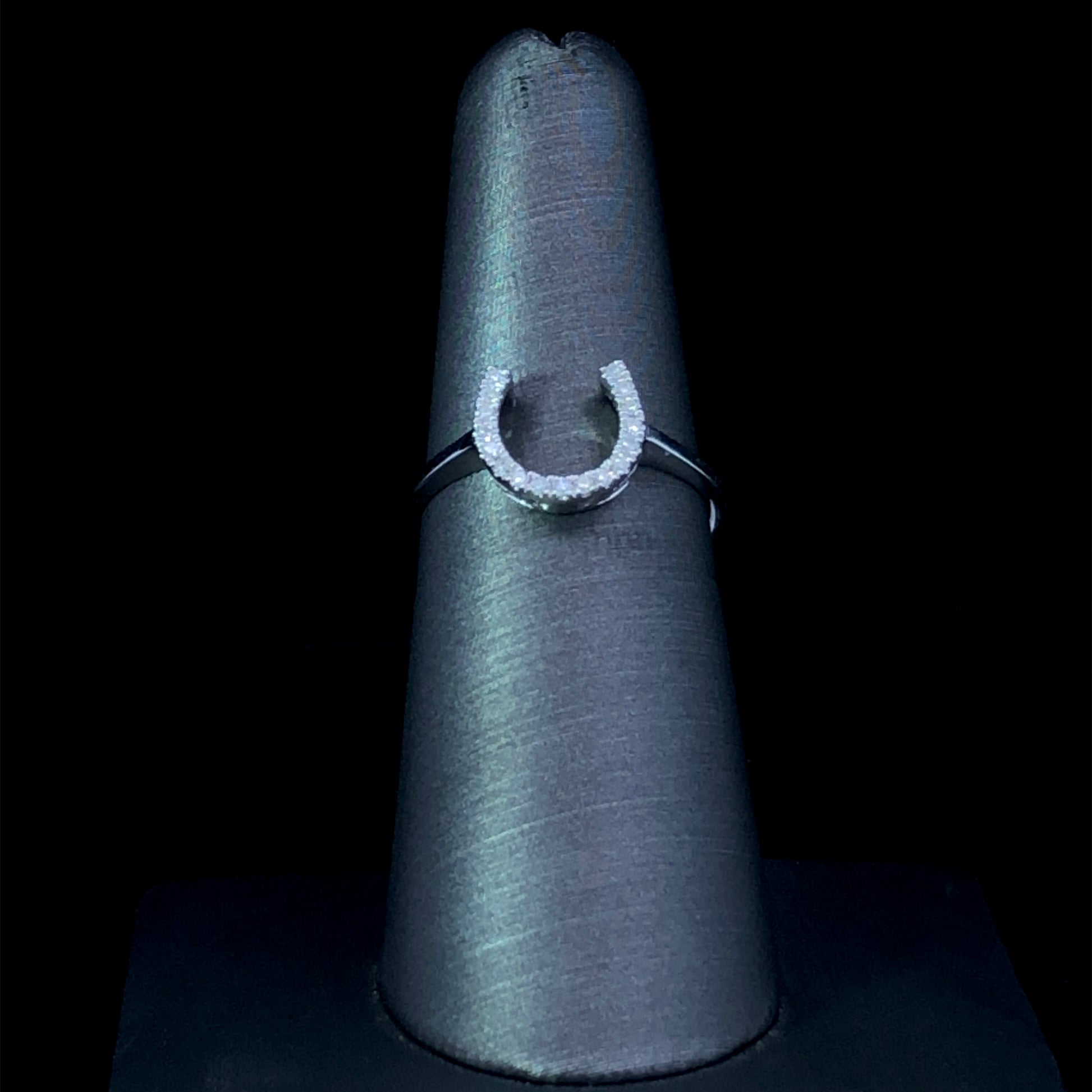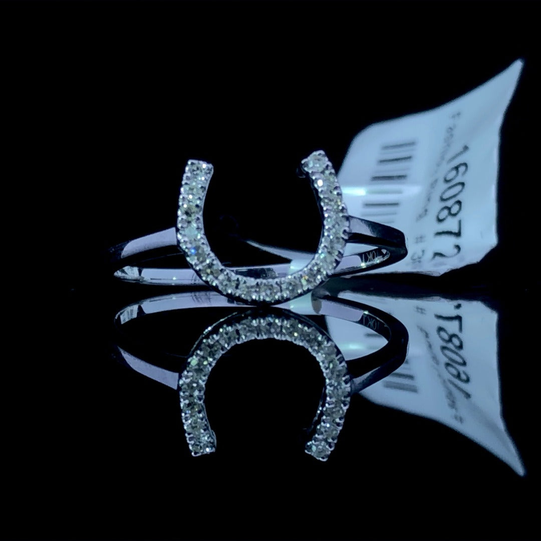 Express your love of western style with this stunning diamond horseshoe ring. Expertly crafted in 10kt white gold, the timeless design of the horseshoe is adorned with .10ctw of brilliant round-cut diamonds, creating an opulent original that's perfect for special occasions. This ring is a size 6.5. If that size is not a perfect fit, first time sizing is free at the time of purchase. Additional sizing fees may apply.