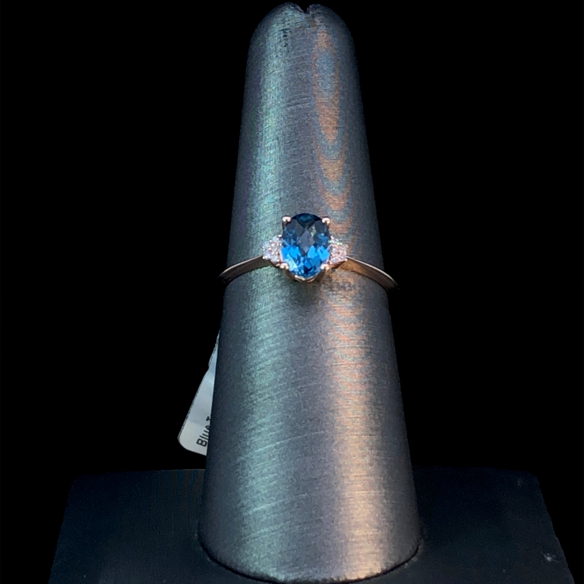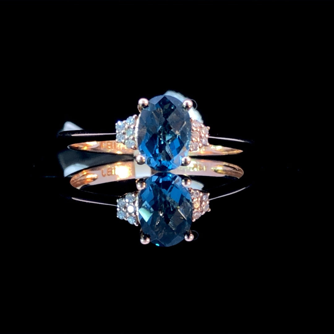 Luxuriate in the timeless beauty of this elegant ring. Crafted in 14kt rose gold, the piece commands attention with its impressive checkerboard cut London blue topaz center and subtle diamond side stones, it boasts exquisite detail. For a truly sophisticated look, let this piece grace your ensemble. This ring is a size 7. If that size is not a perfect fit, first time sizing is free at the time of purchase. Additional sizing fees may apply.