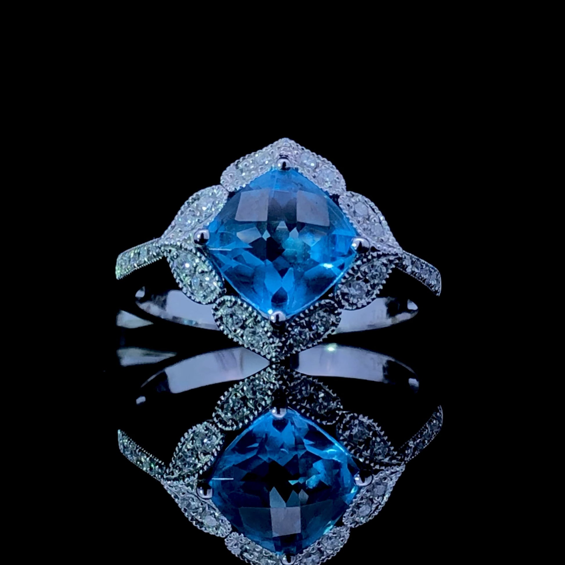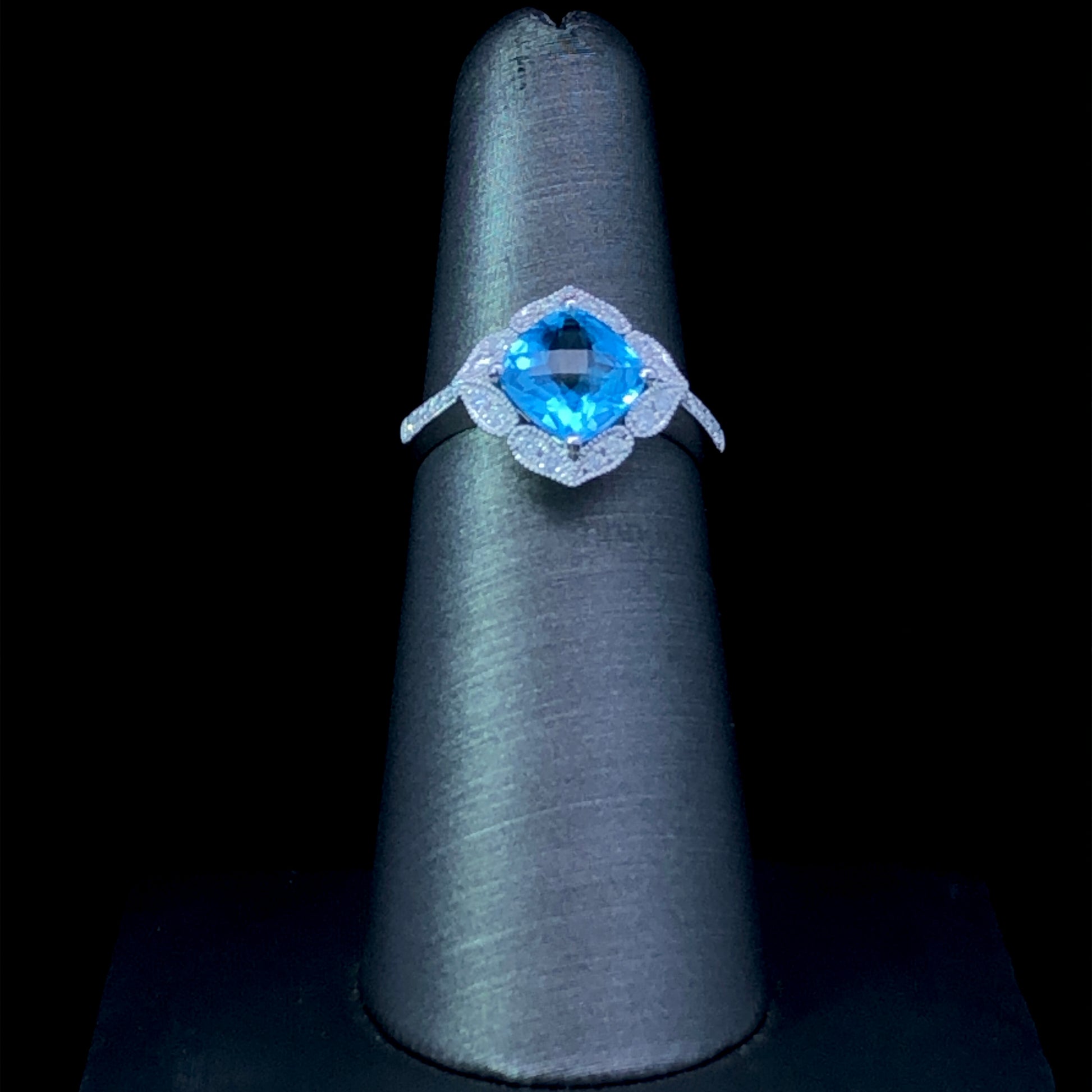 Indulge in the magnificence of this regal ring. Carefully crafted in 14kt white gold, it features a 1.60ct cushion cut blue topaz at the center, bordered by a milgrain halo of .19ctw of dazzling diamonds. Its timeless beauty will make it the perfect piece to cherish for a lifetime. This ring is a size 7. If that size is not a perfect fit, firs time sizing is free at the time of purchase. Additional sizing fees may apply.