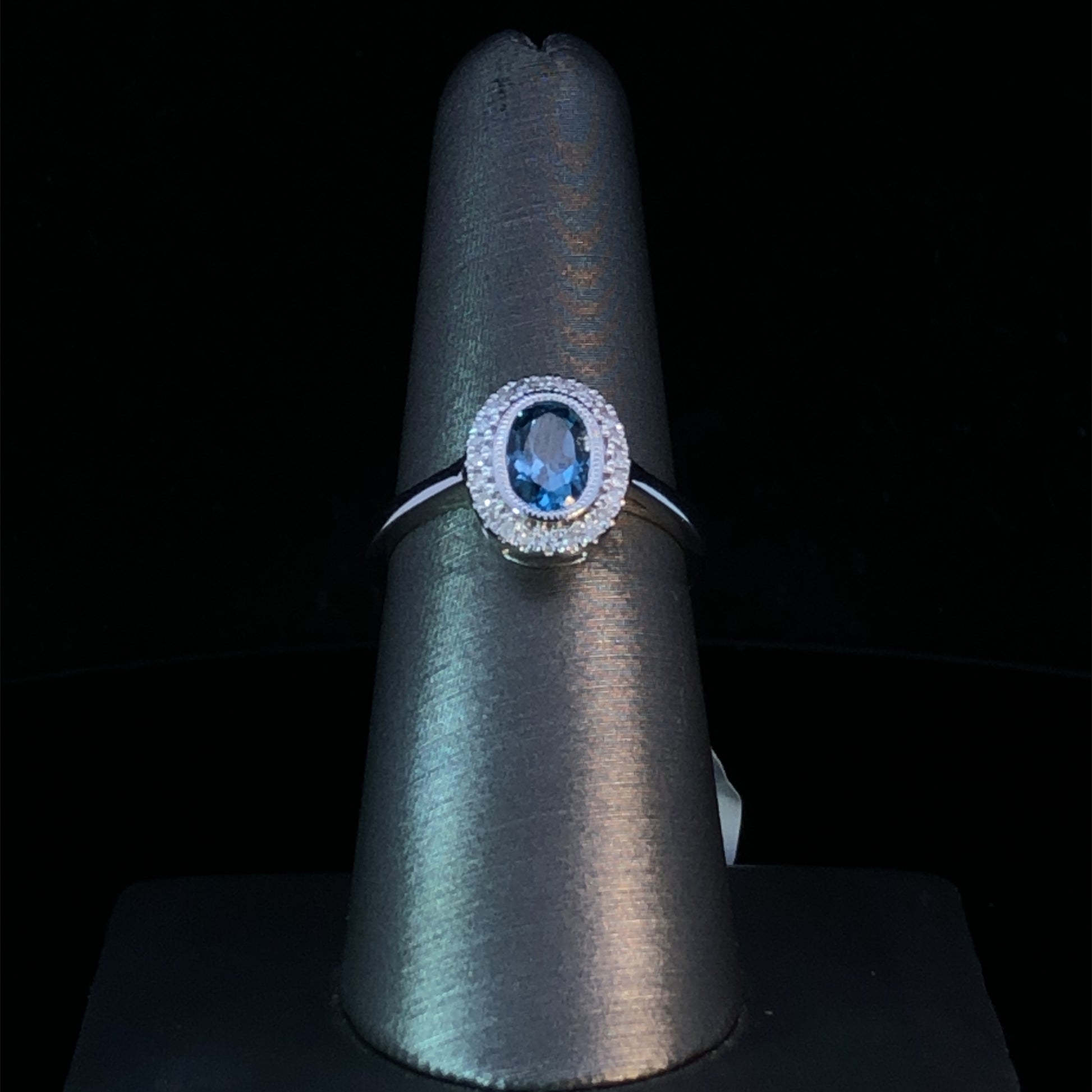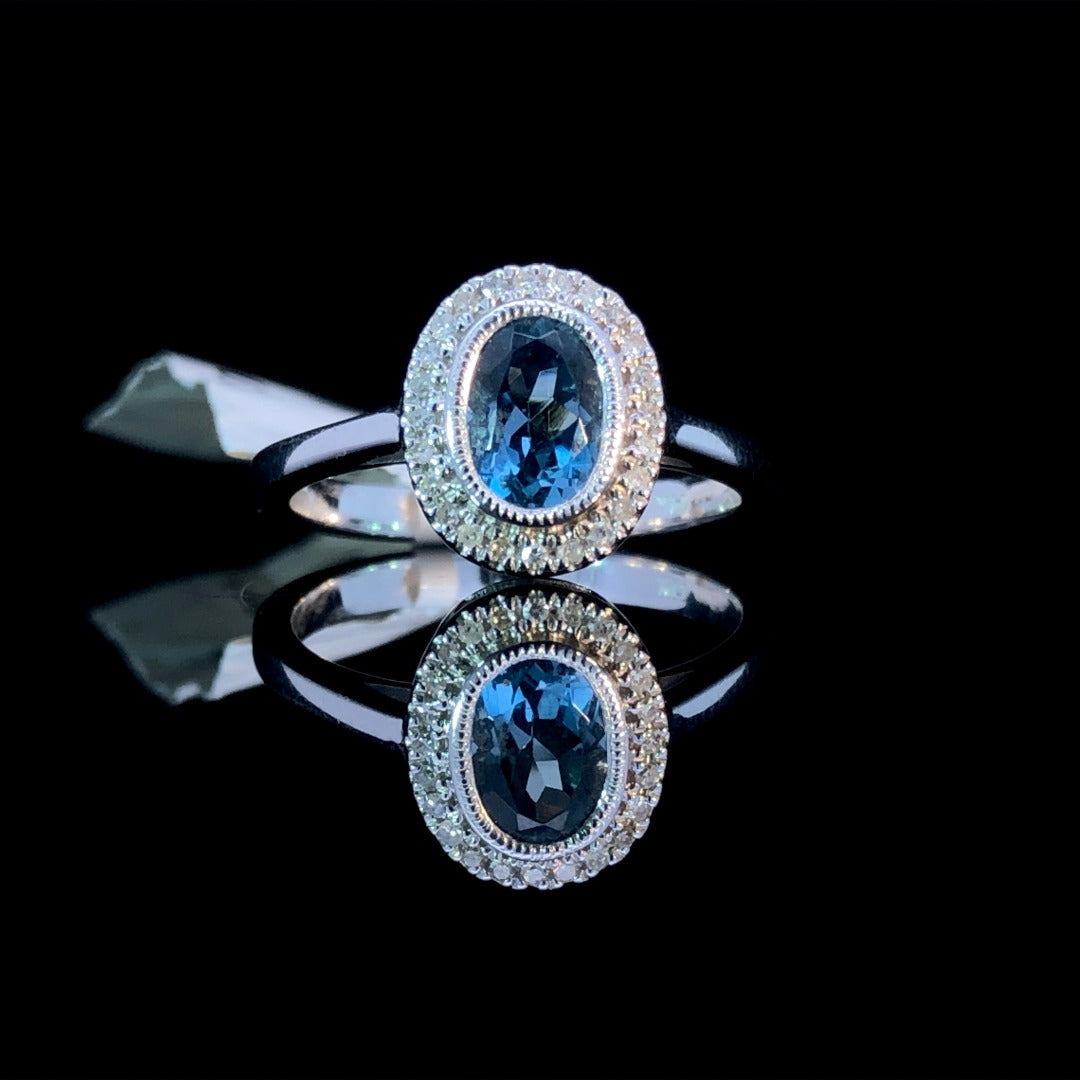 This exquisite ring is sure to dazzle and delight! A breathtaking .92ct oval blue topaz centerpiece is surrounded by a halo of sparkling .12ctw diamonds, set in shimmering 14kt white gold. Make a statement with this glamorous gemstone ring! This ring is a size 7. If that size is not a perfect fit, first time sizing is free at the time of purchase. Additional sizing fees may apply.
