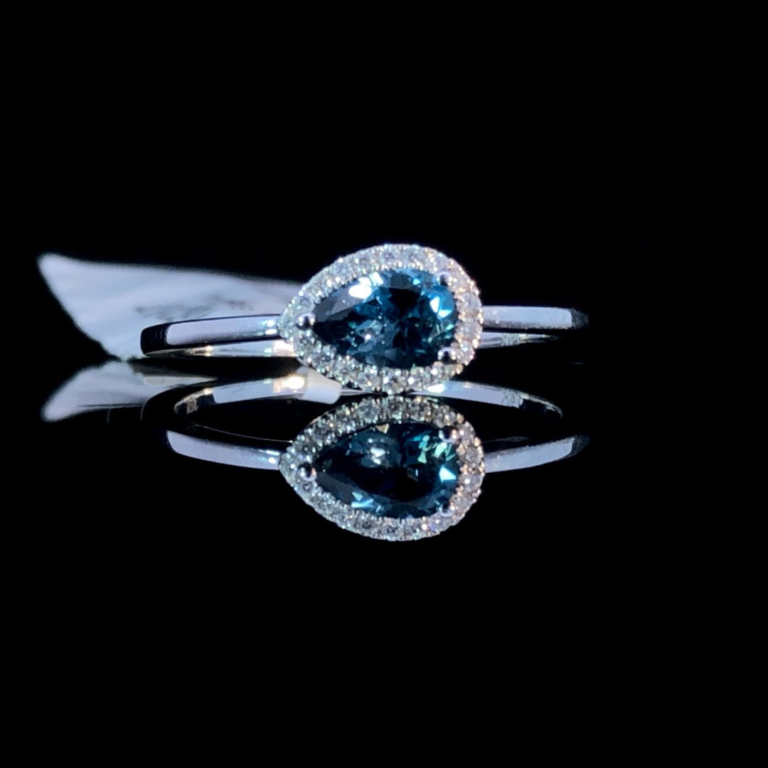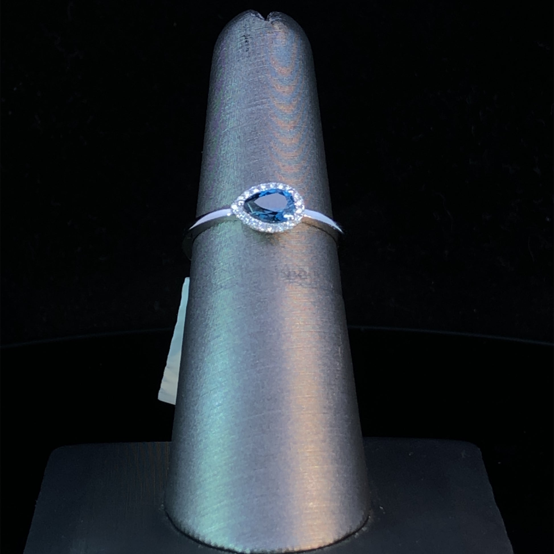 Elevate your look with this mesmerizing ring! Crafted with a .45ct pear shaped London blue topaz surrounded by an illuminating halo of diamonds set in 14kt white gold, this unique piece commands attention. Fall in love with its chic style and timeless beauty! This ring is a size 6. If that size is not a perfect fit, first time sizing is free at the time of purchase. Additional sizing fees may apply.