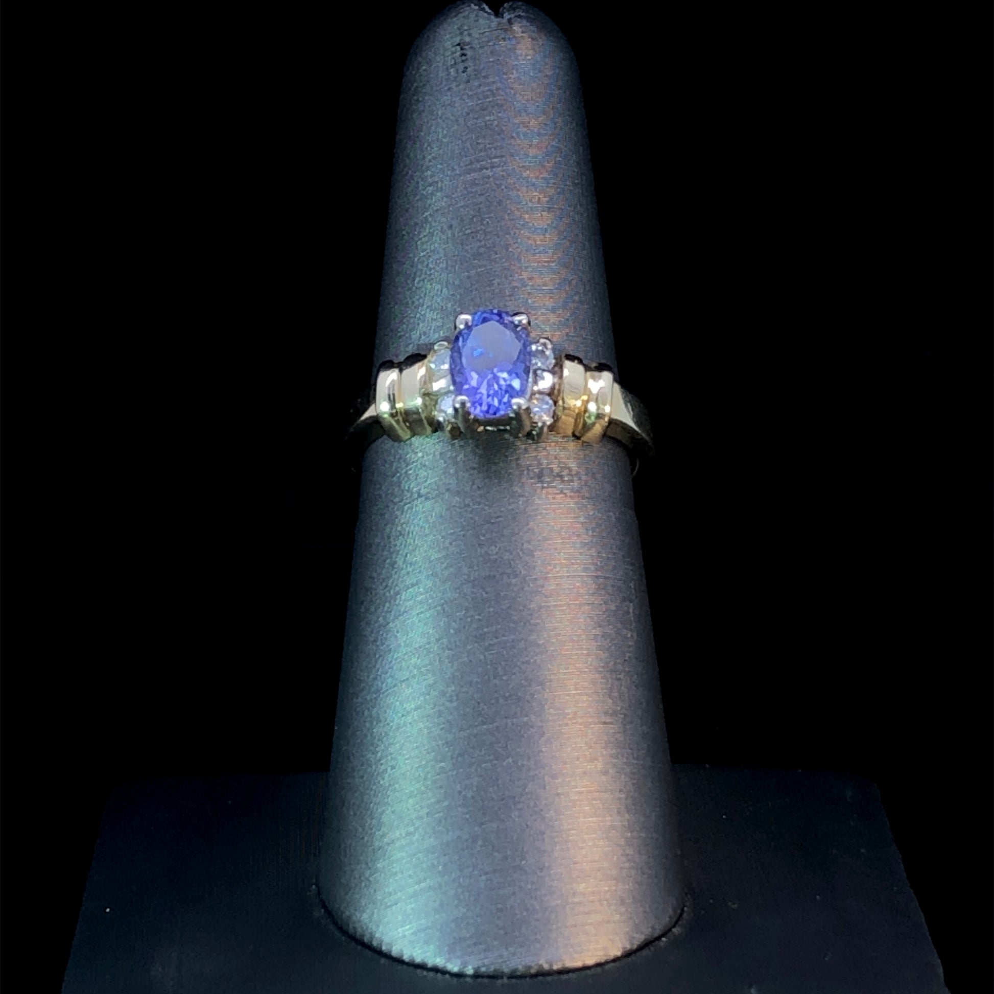 This simply stunning ring will elevate your look with its eye-catching design. Crafted in 14kt yellow gold, the 1.15ct oval tanzanite takes center stage and is beautifully accentuated by the .20ctw of round diamond accents that provide extra shine and sparkle. An elegant piece perfect for any special occasion. This ring is a size 6.75. If that size is not a perfect fit, first time sizing is free at the time of purchase. Additional sizing fees may apply.