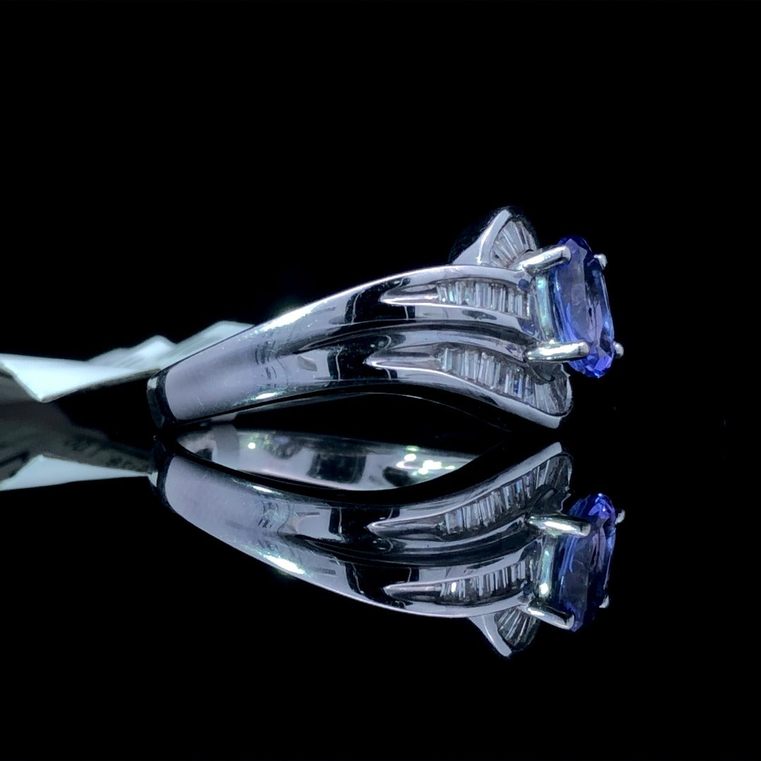 This exquisitely crafted 14kt white gold ring showcases a luxurious .75 ct oval tanzanite center stone, surrounded by .40 ctw of elegant baguette accent diamonds. As if plucked from the pages of a fairytale, this stunning piece is the perfect embodiment of timeless sophistication. This ring is a size 7. If that size is not a perfect fit, first time sizing is free at the time of purchase. Additional sizing fees may apply.