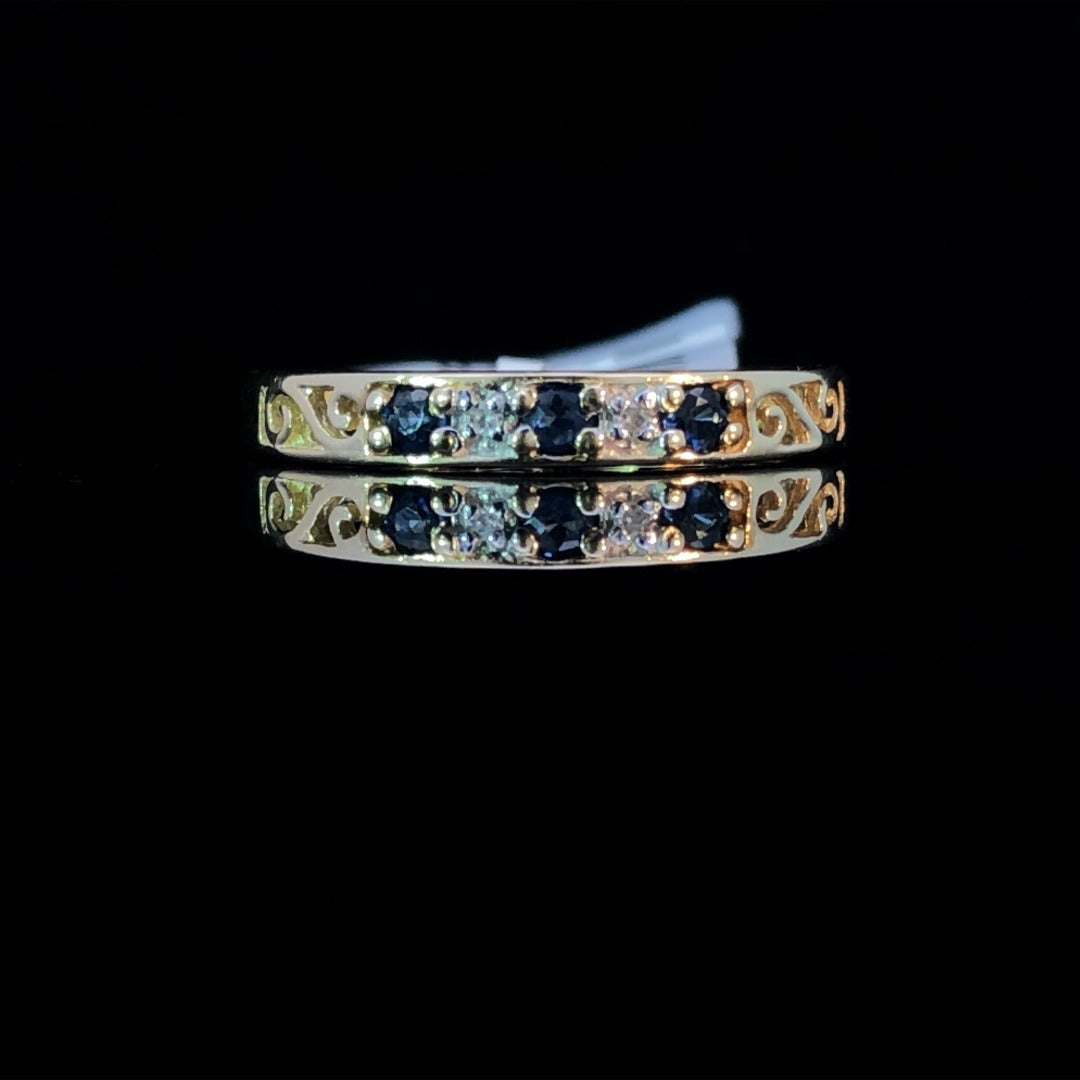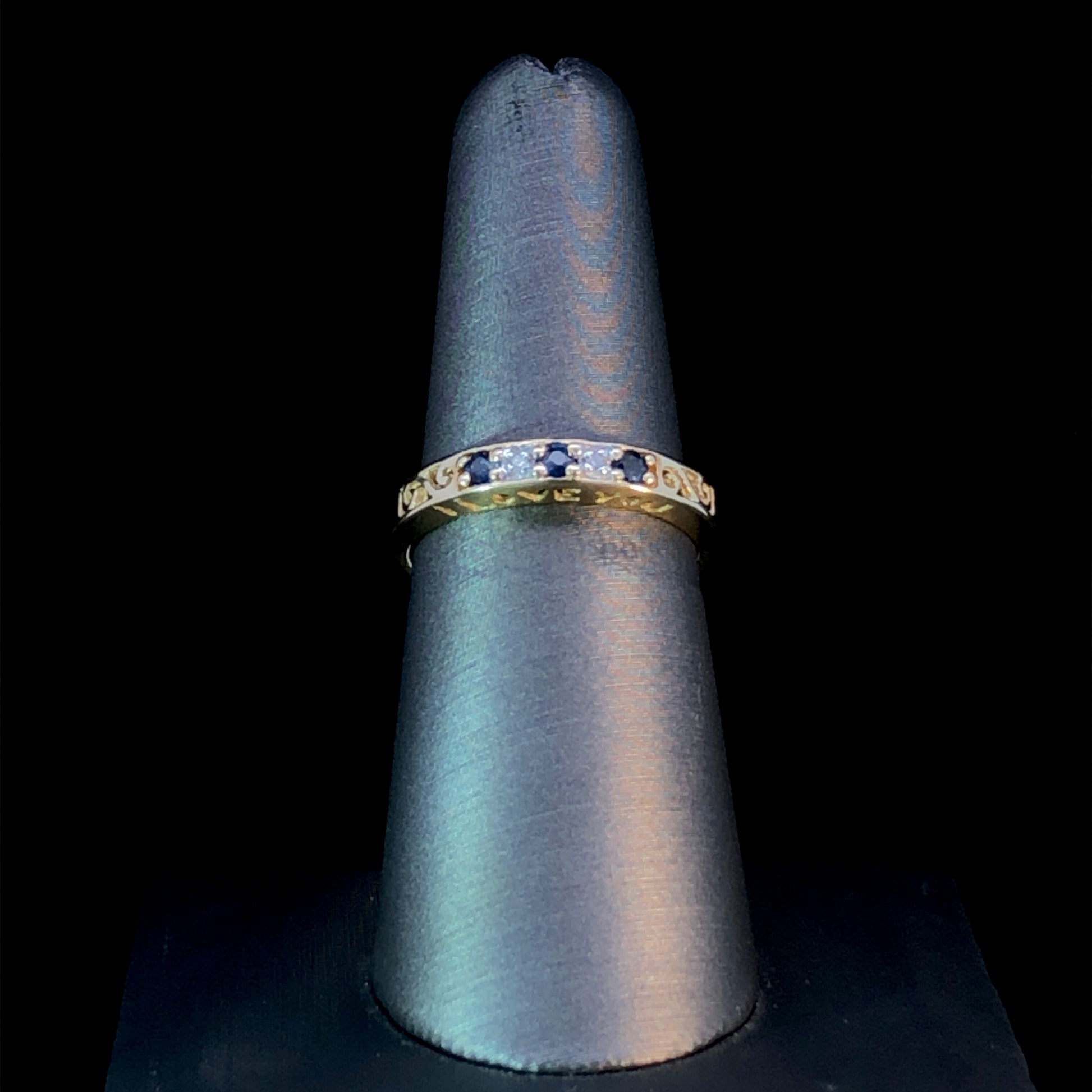 This gorgeous band is the perfect expression of love, featuring a precious pattern of .12ctw of alternating round diamonds and sapphires set in 10kt decorative yellow gold, all beautifully bound together with the meaningful words "I love you" delicately carved into the gold. An exquisite and timeless symbol of your true love. This ring is a size 6.75. If that size is not a perfect fit, first time sizing is free at the time of purchase. Additional sizing fees may apply.