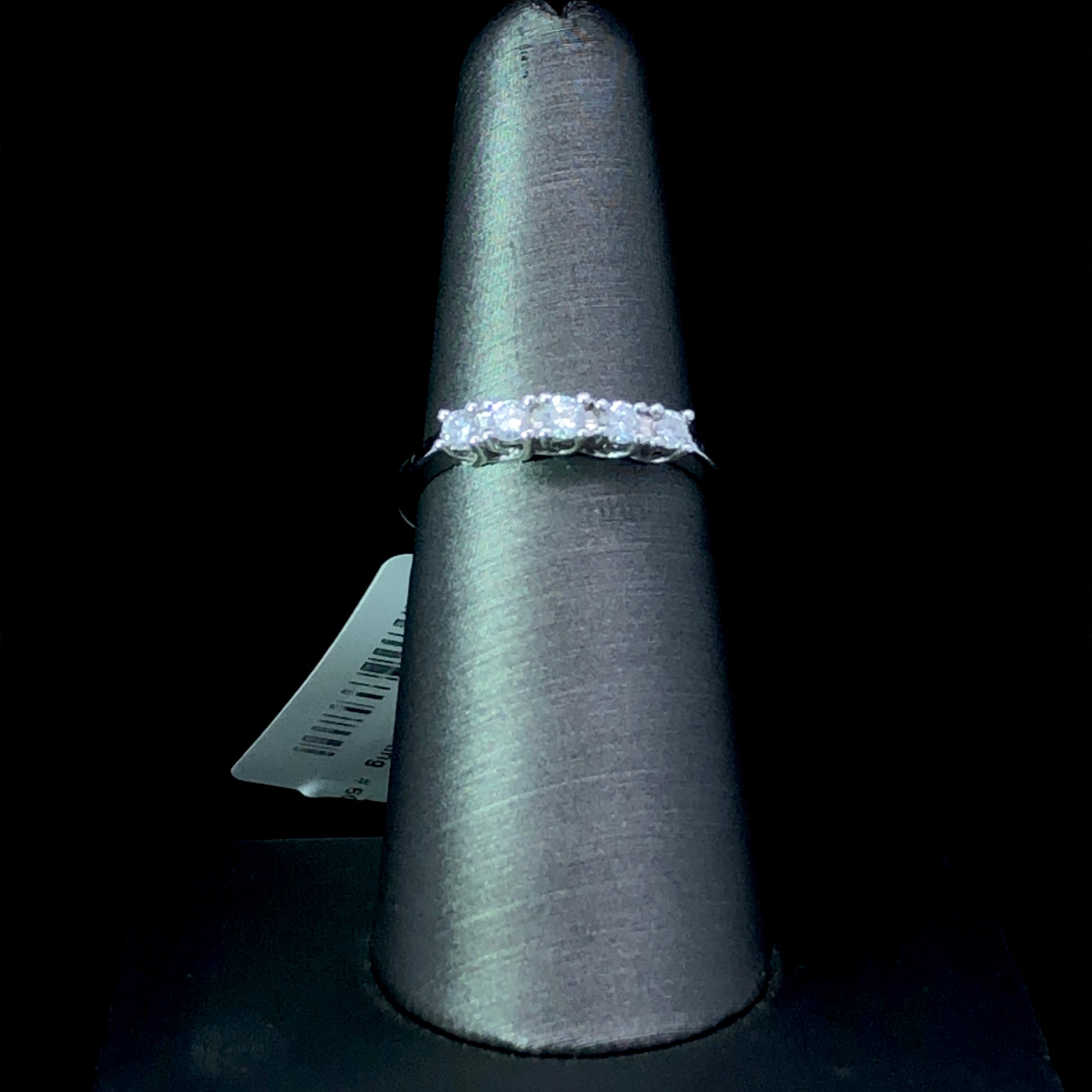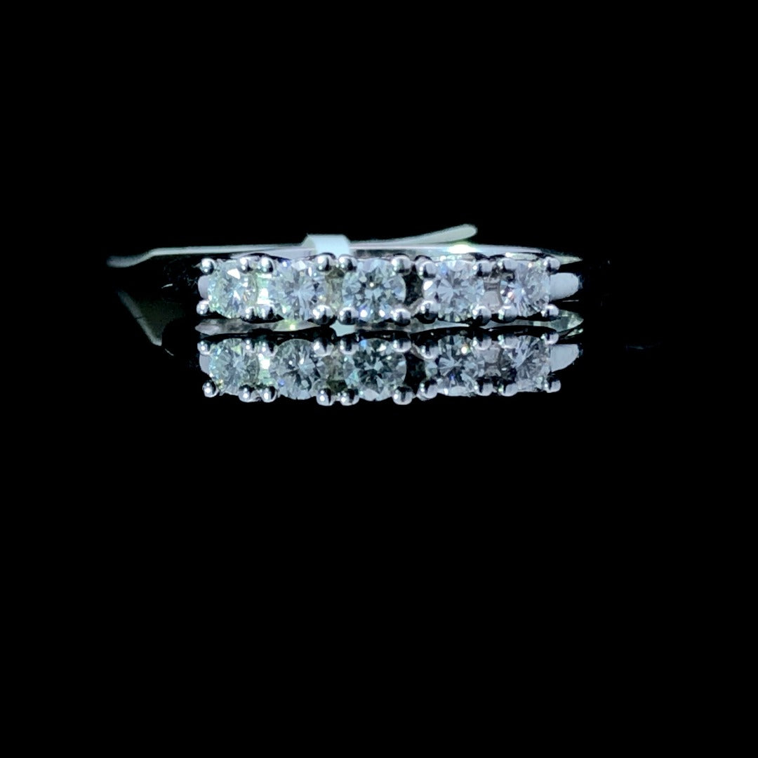 Sparkle in timeless elegance with this classic diamond band. Crafted from 14kt white gold and boasting 5 round diamonds totaling .25ctw, this beautiful piece will be a treasured accessory for years to come. Make an unforgettable statement with graceful sophistication! This ring is a size 6.75. If that size is not a perfect fit, first time sizing is free at the time of purchase. Additional sizing fees may apply.
