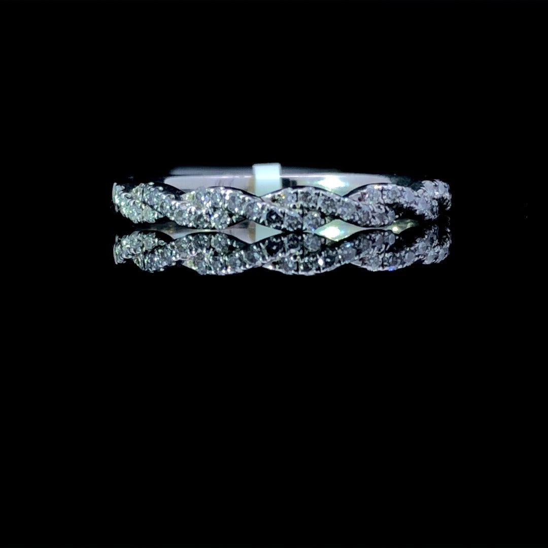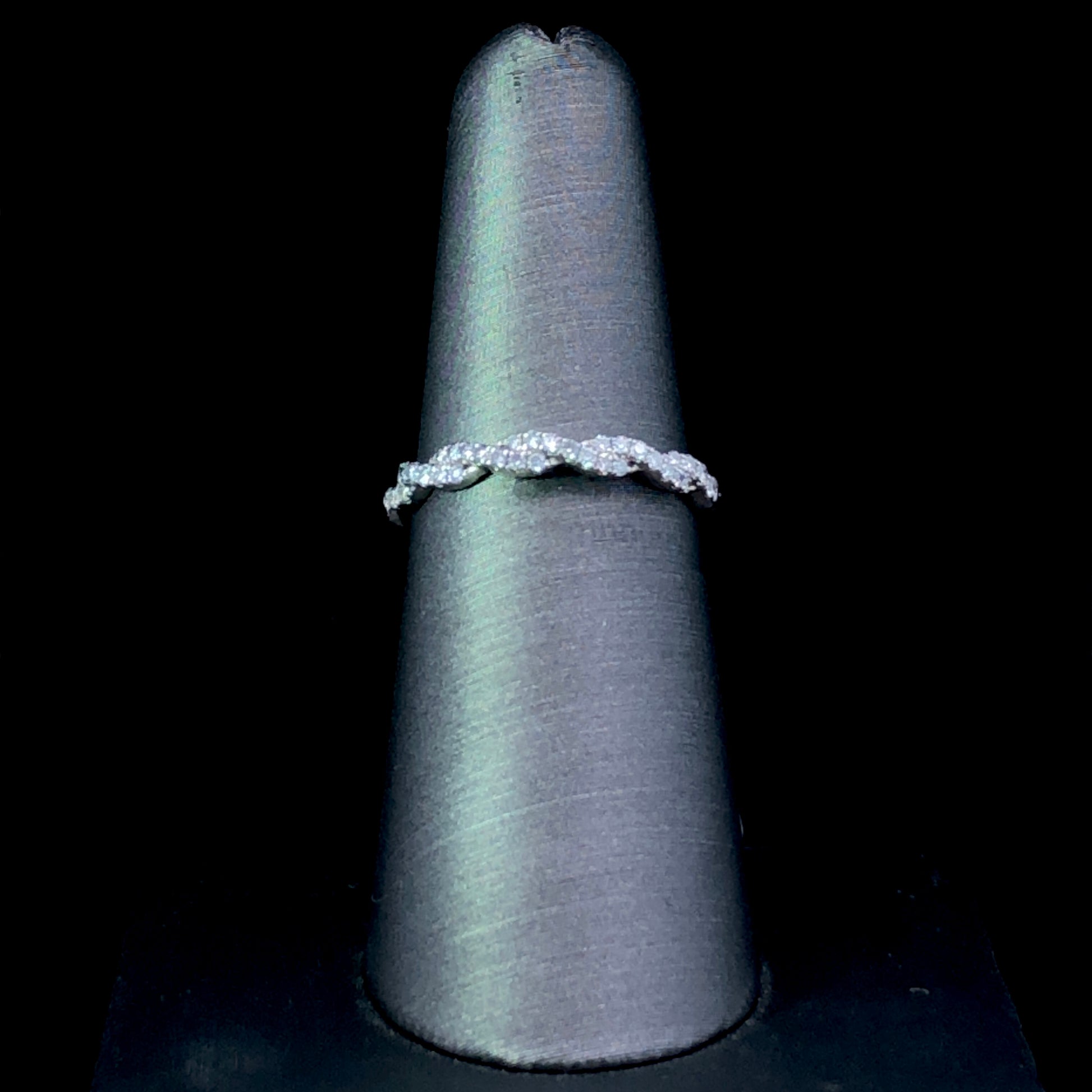 Adorn yourself with the beauty of this awe-inspiring diamond band. Crafted from 14kt white gold, this twist band glitters with .20ctw of round diamonds, designed to bring light and joy to every occasion. Show your love in a truly extraordinary way! This ring is a size 6.5. If that size is not a perfect fit, first time sizing is free at the time of purchase.
