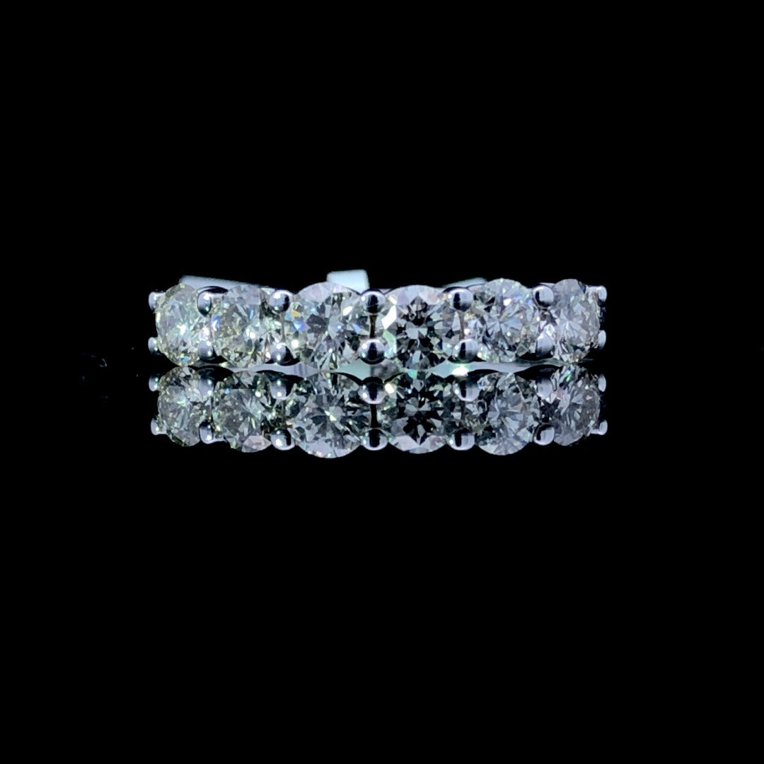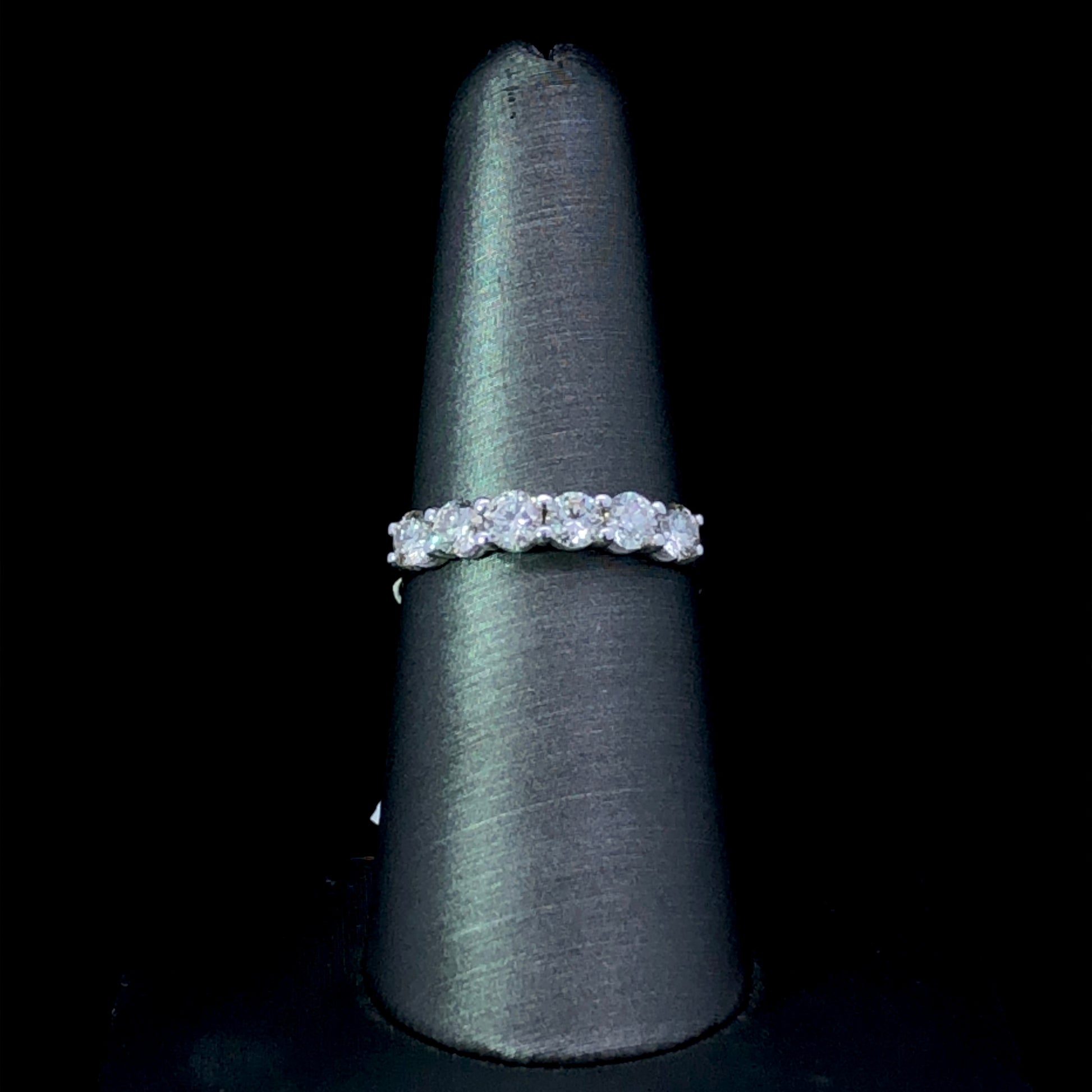 This beautiful 14kt white gold diamond band dazzles with its 6 round diamonds, whose combined weight of .90ctw sparkles regally beneath the light. Showcase your exquisite taste in jewelry with this timeless and unforgettably tasteful diamond band. This ring is a size 7.5. If that size is not a perfect fit, firs time sizing is free at the time of purchase.