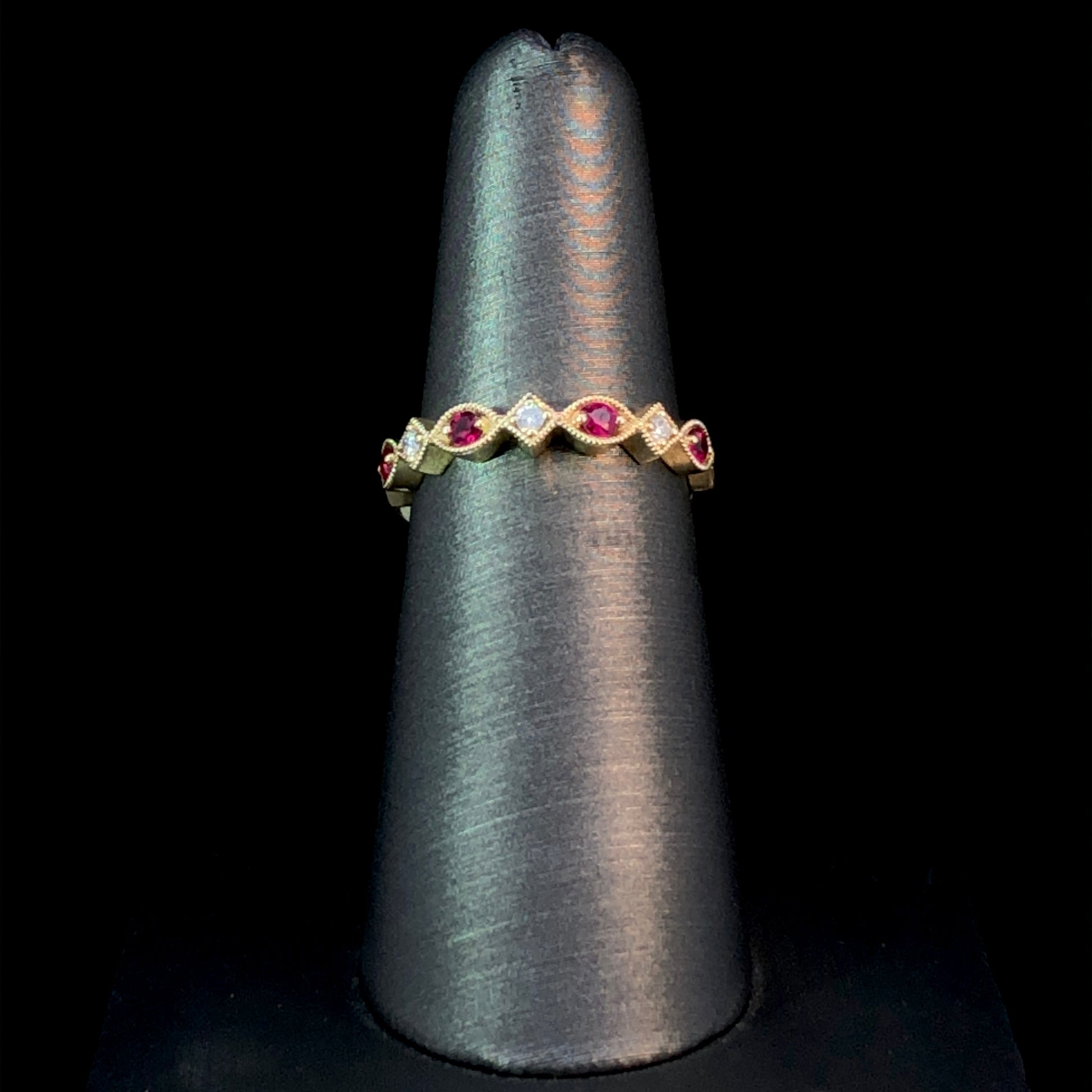 This 14kt yellow gold band sparkles with its unique alternating pattern of round rubies and diamonds surrounded by milgrain detailing. Make a statement with this stunning .25ctw of rubies and .09ctw of diamonds. Perfect for any occasion! This ring is a size 6. If that size is not a perfect fit, first time sizing is free at the time of purchase. Additional sizing fees may apply.