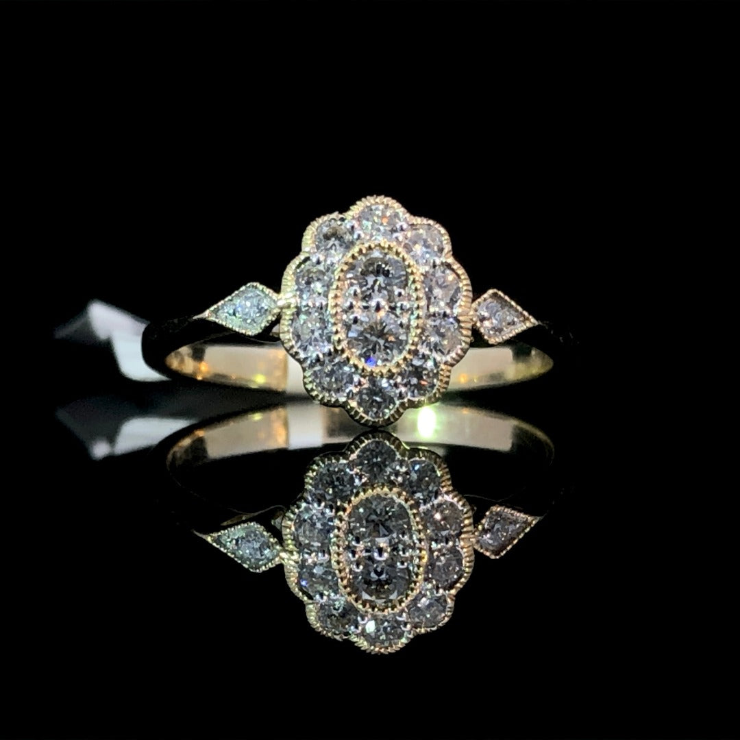 This exquisite ring is crafted to perfection with 10kt yellow gold and dazzling .33ctw of exquisite diamonds. A beautiful cluster in the center is complemented by two side stones, and the milgrain detailing brings a touch of sophistication that will shine for years to come. Wear this opulent ring and proudly show the world a symbol of enduring craftsmanship. This ring is a size 6.5. If that size is not a perfect fit, first time sizing is free at the time of purchase. Additional sizing fees may apply.