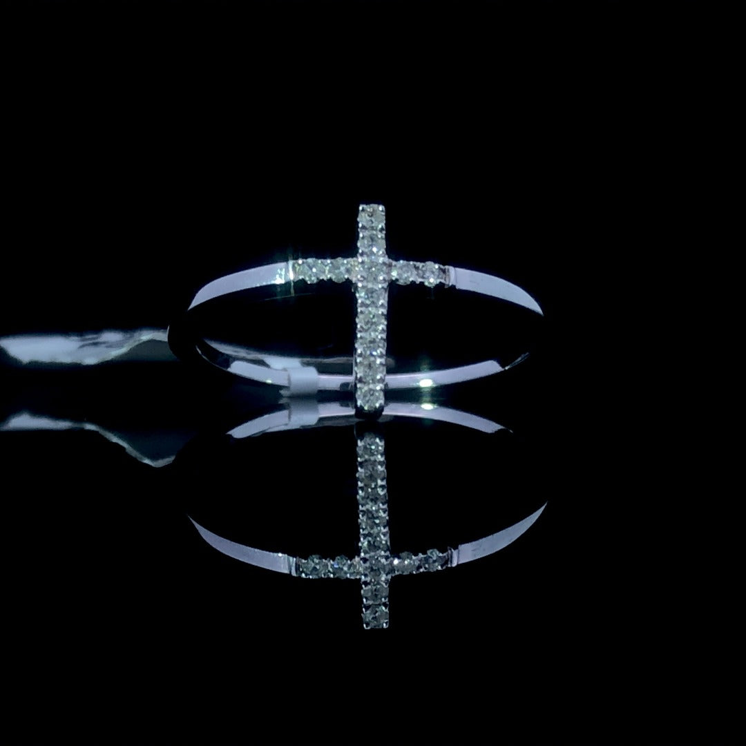 Experience a timeless look with this stunning 14kt white gold ring, boasting a subtle yet unmistakable cross design and .08 ctw of dazzling round diamonds. Classic and elegant, this piece is the perfect addition to any jewelry collection. This ring is a size 6.25. If that size is not a perfect fit, first time sizing is free at the time of purchase. Additional sizing fees may apply.