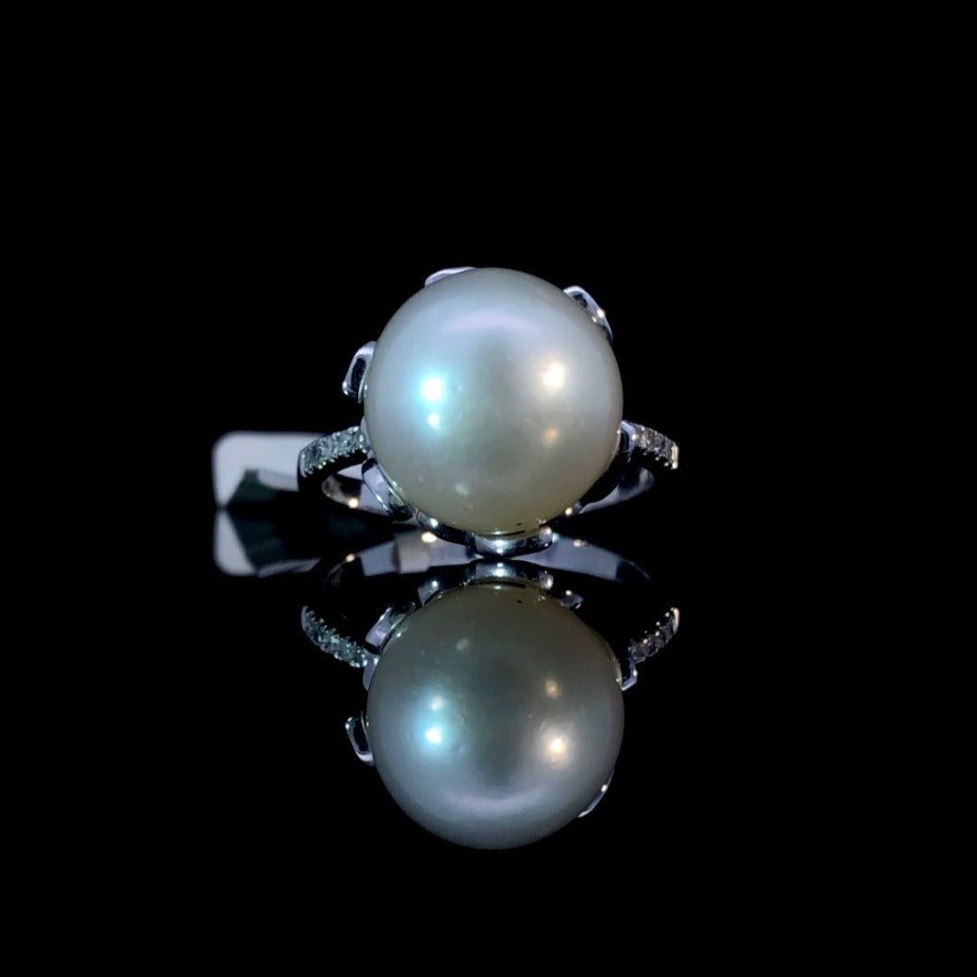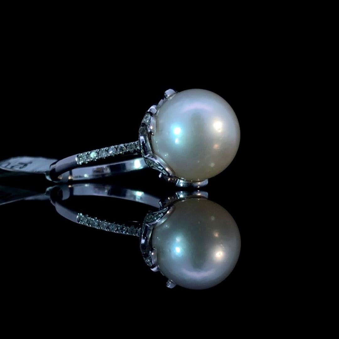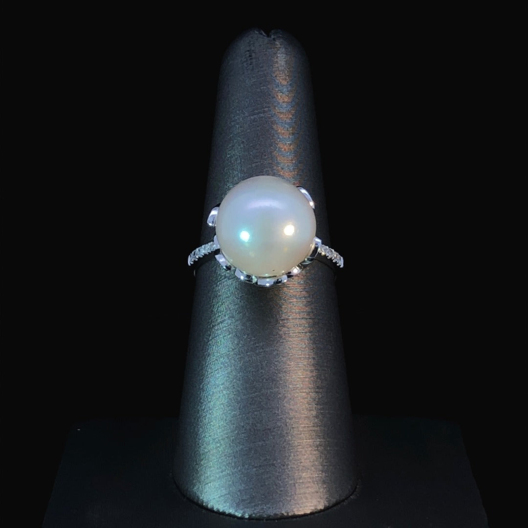 This exquisite ring offers a stunning centerpiece - a 12mm South Sea pearl - set in a delicately crafted head encrusted with sparkling diamonds. An elegant 14kt white gold band adorns the piece with further diamond accents, making it an exquisite and timeless addition to any collection with its .36ctw of round diamonds. This ring is a size 7. If that size is not a perfect fit, first time sizing is free at the time of purchase. Additional sizing fees may apply.