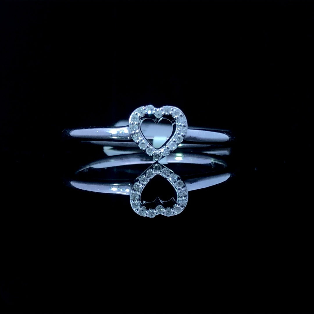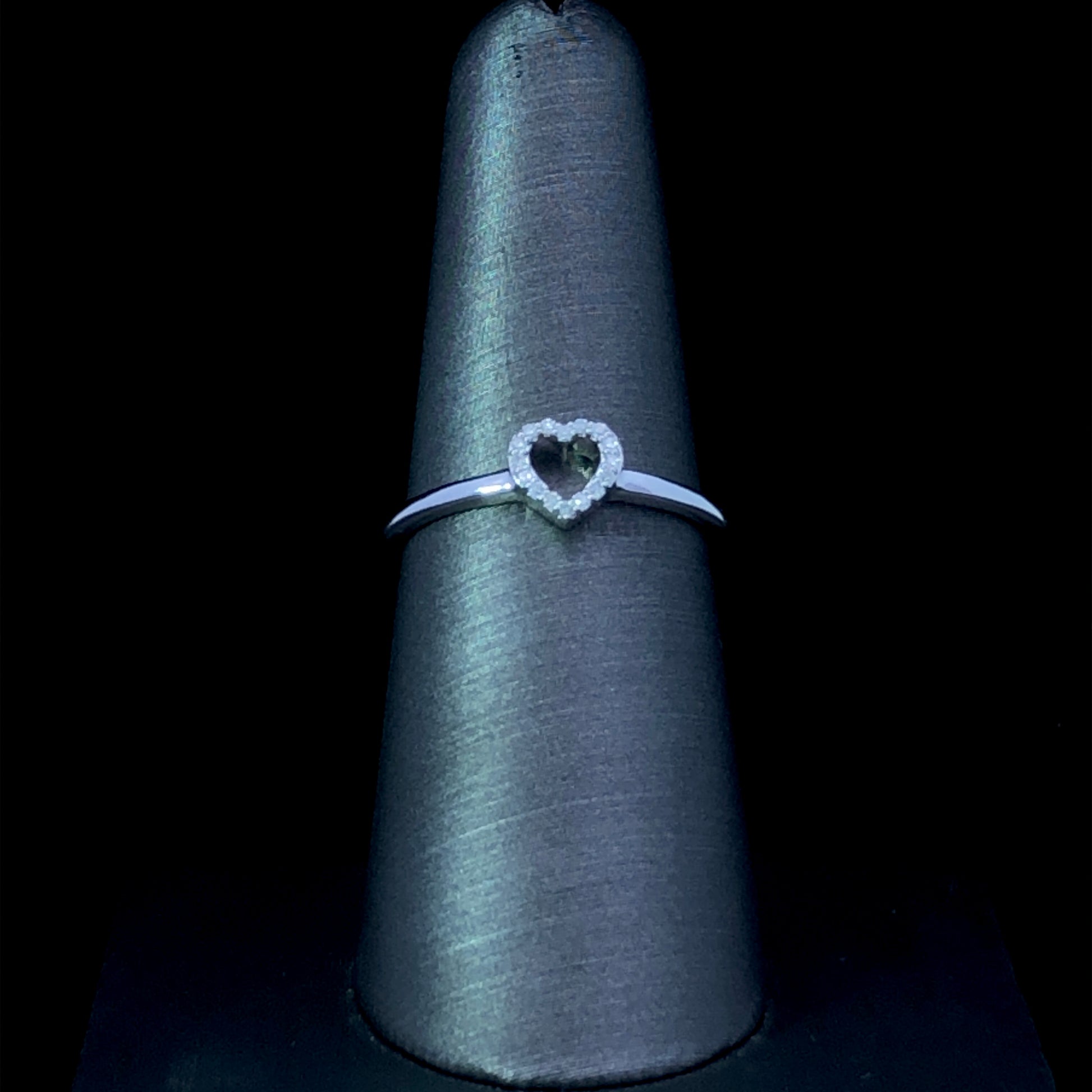 This .06ctw diamond heart ring is sure to keep your heart at center stage. Set in a classic 14kt white gold, it's the perfect delicate accessory for any occasion. This ring is a size 7.25. If that size is not a perfect fit, first time sizing is free at the time of purchase. Additional sizing fees may apply.