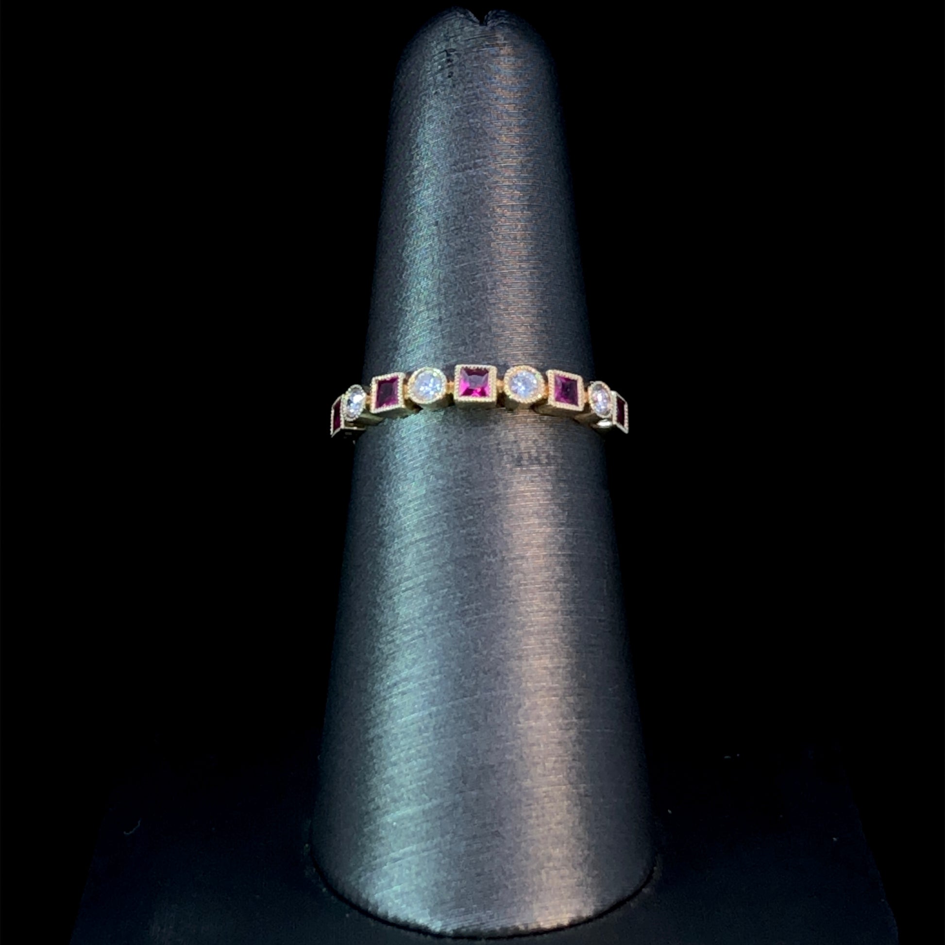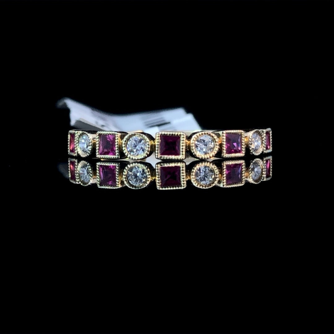 Adorn your look with this stylish and stunning gold band! Featuring alternating rubies and sparkling diamonds set in a luxe milgrain setting, this 14 kt yellow gold piece adds a hint of color and a lot of sparkle to your look. Designed to be cherished forever, this stunning band is the perfect accent to any ensemble! This ring is a size 7. If that size is not a perfect fit, first time sizing is free at the time of purchase. Additional sizing fees may apply.