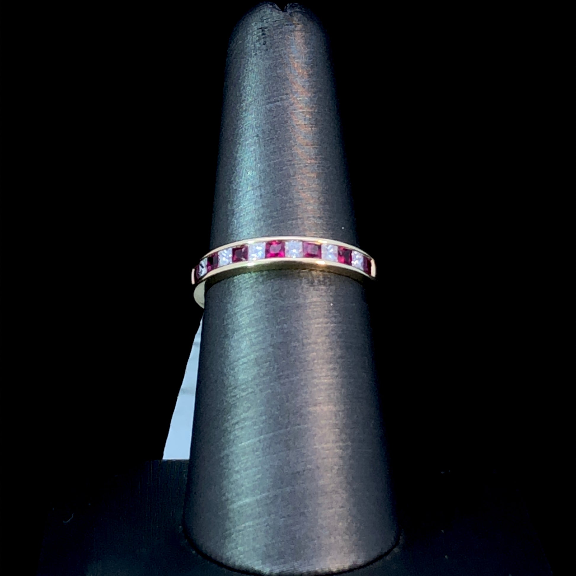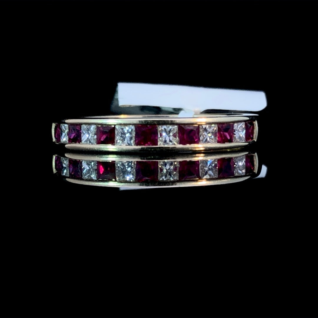 Look elegant and exquisite with this timeless 14kt yellow gold band featuring .55ctw of alternating diamonds and rubies. Perfect for everyday wear or special occasions, this classic band will compliment your unique style with a luxurious brilliance. Be sure to turn heads with its radiant beauty! This ring is a size 7. If that size is not a perfect fit, first time sizing is free at the time of purchase. Additional sizing fees may apply.